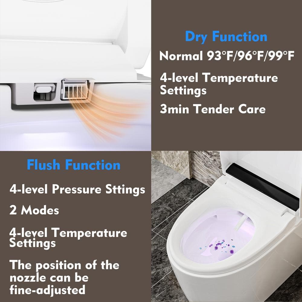 Features Adjustable Aerated Wash Spray,Adjustable Nozzle,Adjustable Sprayer Settings,Adjustable Water Pressure,Battery Operated Flushing System,Feminine Wash,Heated,Lighted,Motion Sensing,Posterior Wash,Remote Control Operation,Self-Cleaning,Touchless,Warm Air Dryer