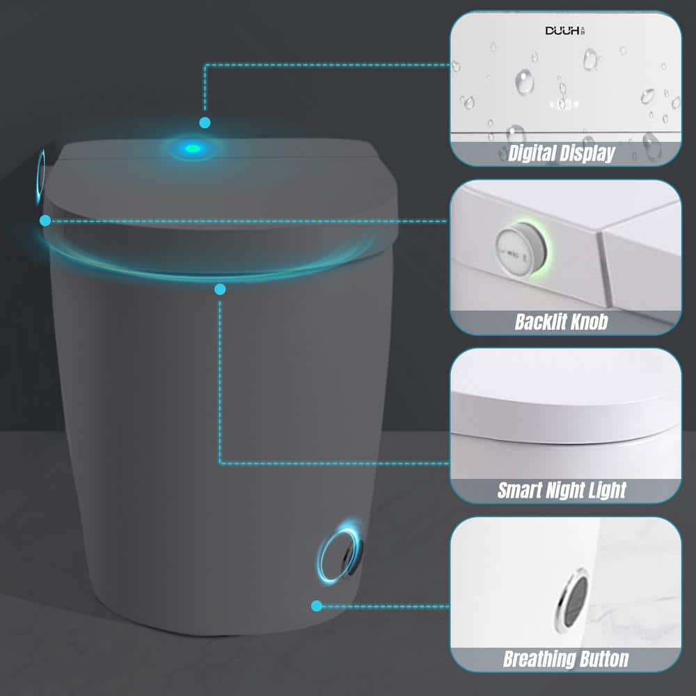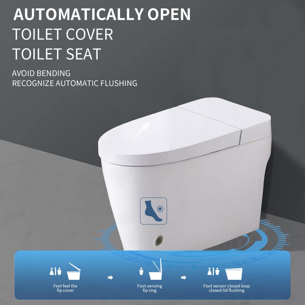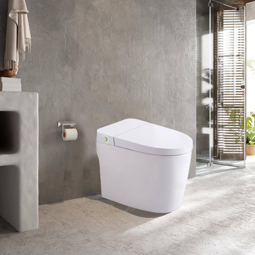 The HOMEMYSTIQUE Height Intelligent Toilet Bidet in White combines luxury and functionality with its tankless design and advanced features such as automatic open/close, flushing, and a heated seat. Ideal for cold seasons, it also comes with a remote for easy control, making bathroom visits a personalized and comfortable experience.