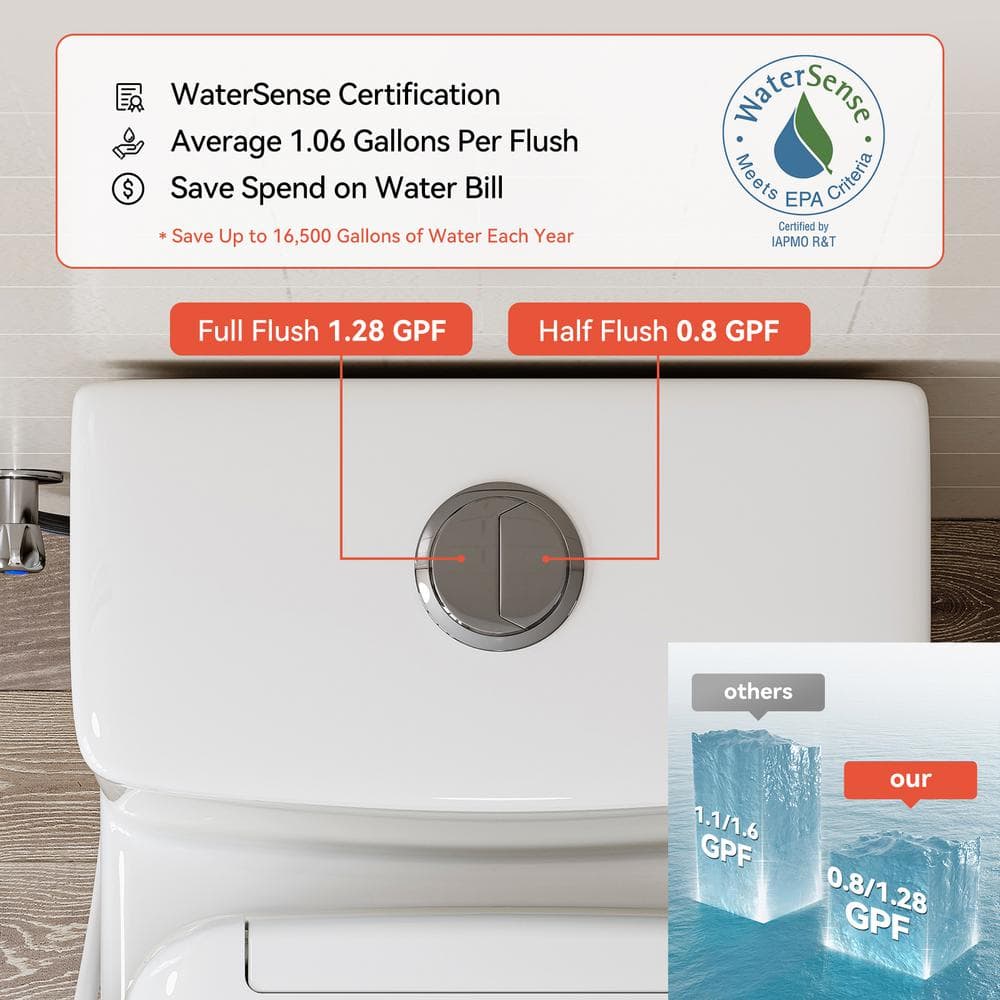 • Water-Saving Dual Flush: 0.8/1.28 GPF system saves up to 16,500 gallons of water annually.