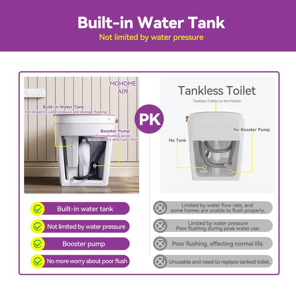• Powerful Flushing: Built-in tank with booster pump for consistent, powerful flushing.