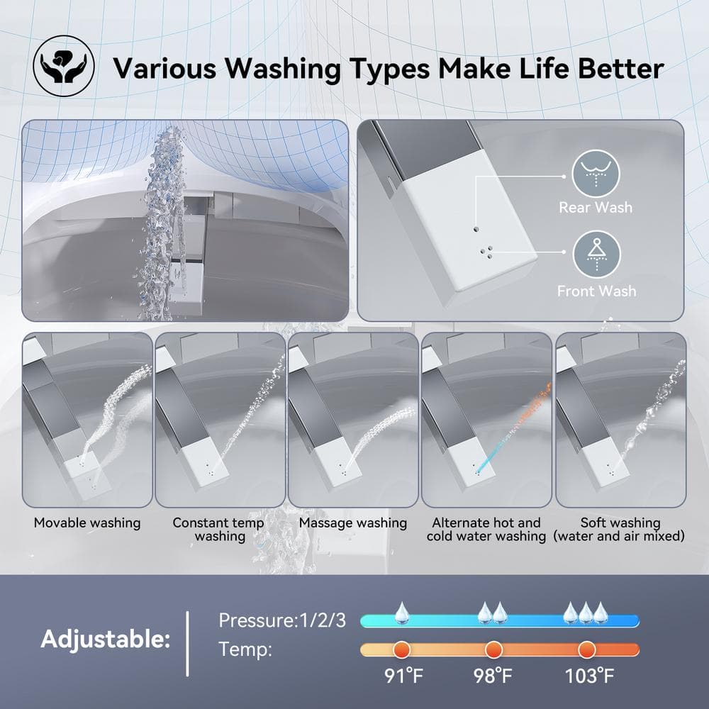 • Luxurious Comfort: Heated seat and warm air dryer with adjustable temperatures for personalized comfort.