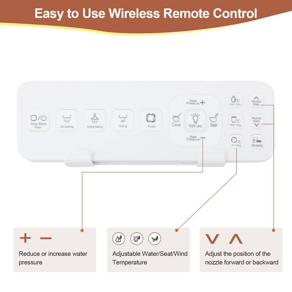 Features Adjustable Sprayer Settings,Adjustable Water Pressure,Air Purifier,Antimicrobial,Automatic Close,Automatic Open,Battery Operated Flushing System,Concealed Trapway,Control Panel,Feminine Wash,Heated,Integrated Bidet,Lighted,Motion Sensing,Nozzle Sterilization,Remote Control Operation,Skirted Design,Soft Close,Warm Air Dryer,Warm Water Wash