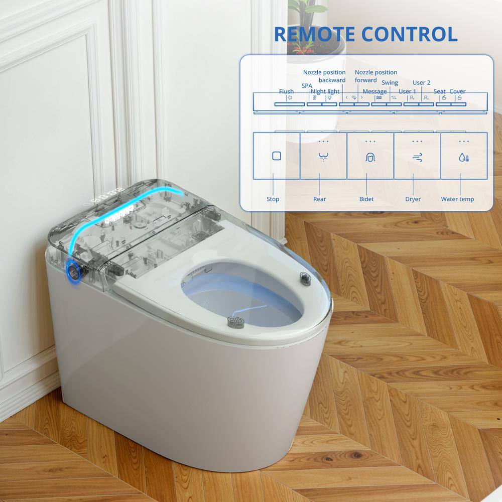 The Relyblo Foot Sensing Elongated Bidet Toilet offers a premium bathroom upgrade with its spa-like features and smart functionality. Enjoy the comfort of instant heating and a remote-controlled spa spray, while maintaining hygiene with anti-bacterial materials. Its eco-mode ensures an energy-efficient and ultra-modern touch to your home.