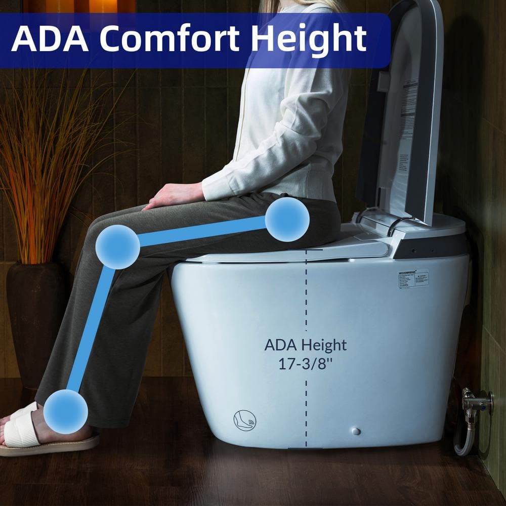 The WOODBRIDGE Elongated ADA Smart Bidet Toilet revolutionizes your bathroom with its advanced features. This modern toilet offers a no-touch experience with automatic lid opening and a foot sensor for seamless control, while the foam shield minimizes splashes and odors for a clean, comfortable environment. Experience unparalleled comfort with the integrated heated seat and UV sterilization for ultimate hygiene.