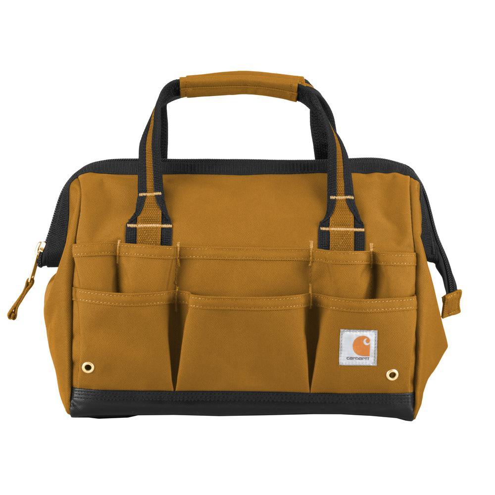 Get the job done right the first time with the Carhartt Legacy Tool Bag. Perfect for the DIY-er and those who show up to the job site every day. Constructed of heavy-duty 1200D Poly with Rain Defender durable water repellent, this rugged bag can handle even the toughest jobs. It also features a Duravax abrasion-resistant base or custom molded load-bearing base, both of which provide extra protection from hazardous job site conditions as well as scrapes and punctures from tools. Note the triple needle stitch provides reinforcement where it counts. The internal metal frame offers structure to the bag so you can get in and get out without it collapsing in on itself. Tools stay organized and easy to find with a variety of different sized pockets and loops. Additional details: YKK zippers, metal hardware, reinforced webbing and comfort grip haul handles, Carhartt logo patch.