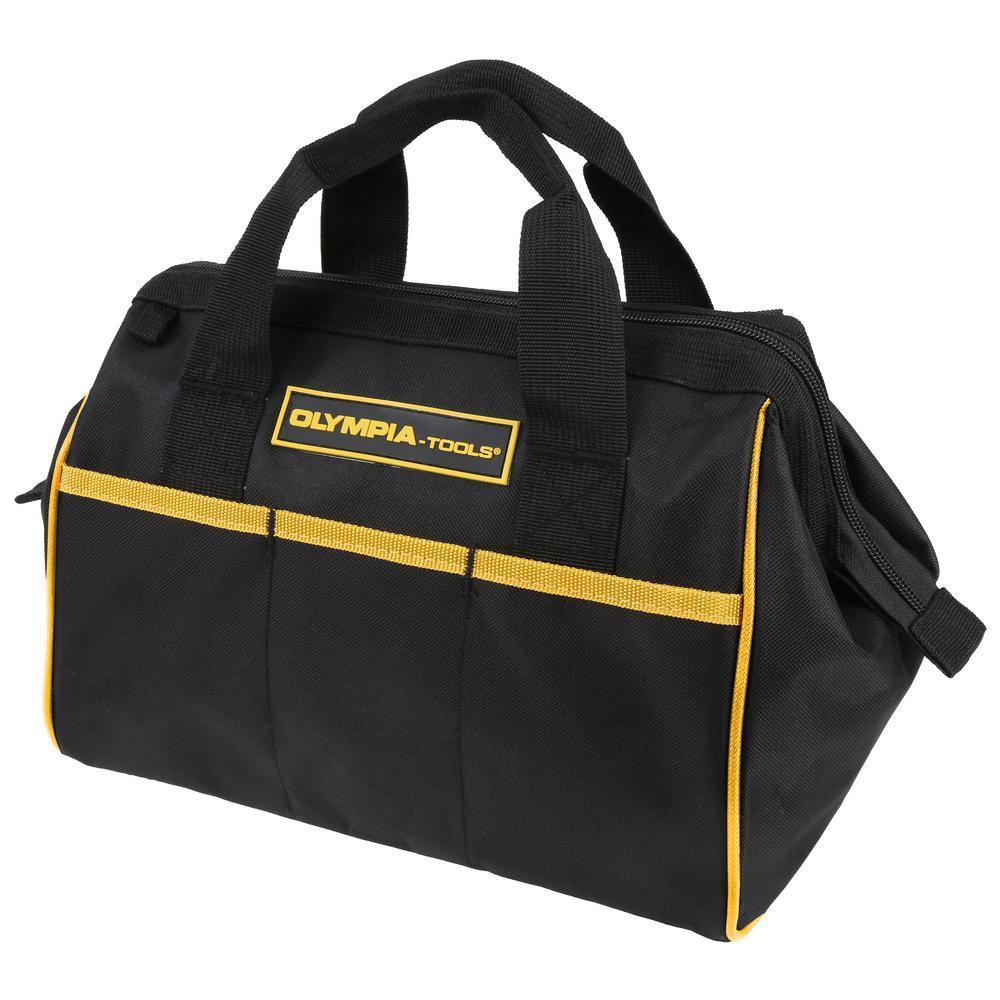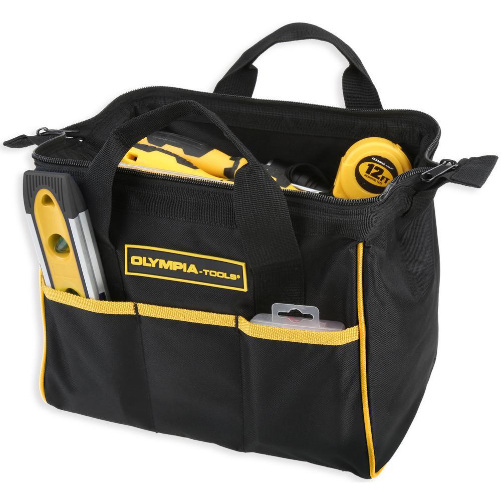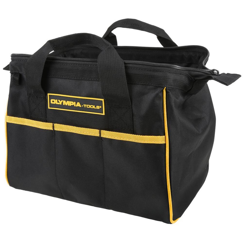 The OLYMPIA 12 in. Tool Bag constructed with tough Nylon, has a roomy open interior with 3 External Pockets for extra space to hold all your smaller tools. It is made with a Double Strap Handle and Full Zipper Closure for added security. Overall Dimensions: 1.87 in. L x 14.31 in. W x 8.23 in. H.