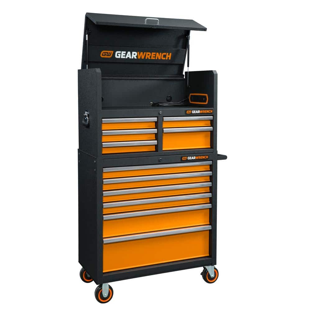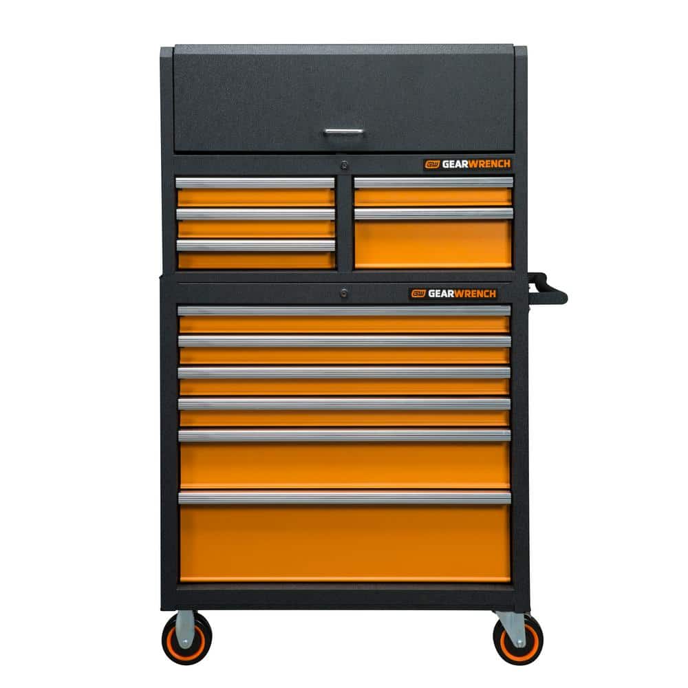Transform your workspace with the sophisticated and rugged GEARWRENCH 36 in. Tool Cabinet. This piece isn't just a storage solution; it's a design statement, boasting a striking black and molten orange finish that elevates any garage. Its sleek aluminum drawer pulls add a touch of modern elegance while offering practical strength. Position this cabinet in your workspace for both function and a stylish focal point that whispers professionalism and luxury in every drawer.
