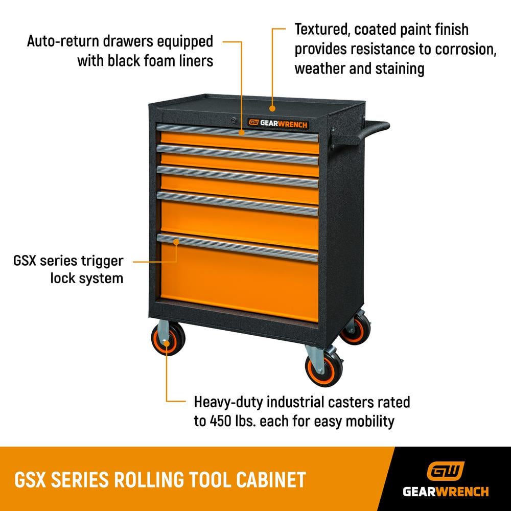 The GEARWRENCH 36 in. 6-Drawer GSX Series Rolling Tool Cabinet is engineered for the utmost durability and convenience for professional users. Crafted from 20-gauge steel with a textured coated finish, it stands ready to endure the toughest environments while providing exceptional storage solutions. With its integrated power strip and heavy-duty casters, this tool cabinet ensures your workspace remains organized and mobile.