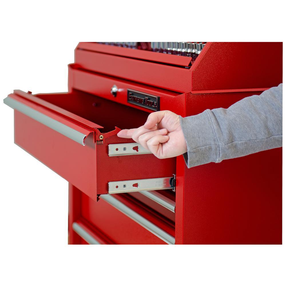 Keep your equipment and hardware organized with the Extreme Tools PWS 41 in. 11-Drawer Tool Chest Combo in Red. With a portable design, this tool chest combo can be moved around for ultimate customization. Ideal for both DIYers and professional tradesman, it is built with an 18-Gauge steel construction to ensure toughness and structural integrity. This Extreme Tools tool storage system features a textured gloss powder coating with scratch and weather-resistant properties, which strengthen the unit and offer increased protection from normal wear and tear experienced in a garage. It has 11-drawers 5 small, 5 medium and one 1 and features a total holding capacity of 19,370 cu. in., providing the ideal storage solution for all of your equipment. Perfect for effortless operation, it is designed with ball bearing slides that can hold up to 100 lbs. to accommodate heavy loads. This Extreme Tools tool cabinet is built with a tubular coded lock and key system, designed to offer you peace of mind. It has swivel and fixed casters that support up to 550 lbs. and a push handle, which enables you to easily maneuver it around your workspace. Always find what you need with the Extreme Tools PWS 41 in. 11-Drawer Tool Chest Combo in Red.