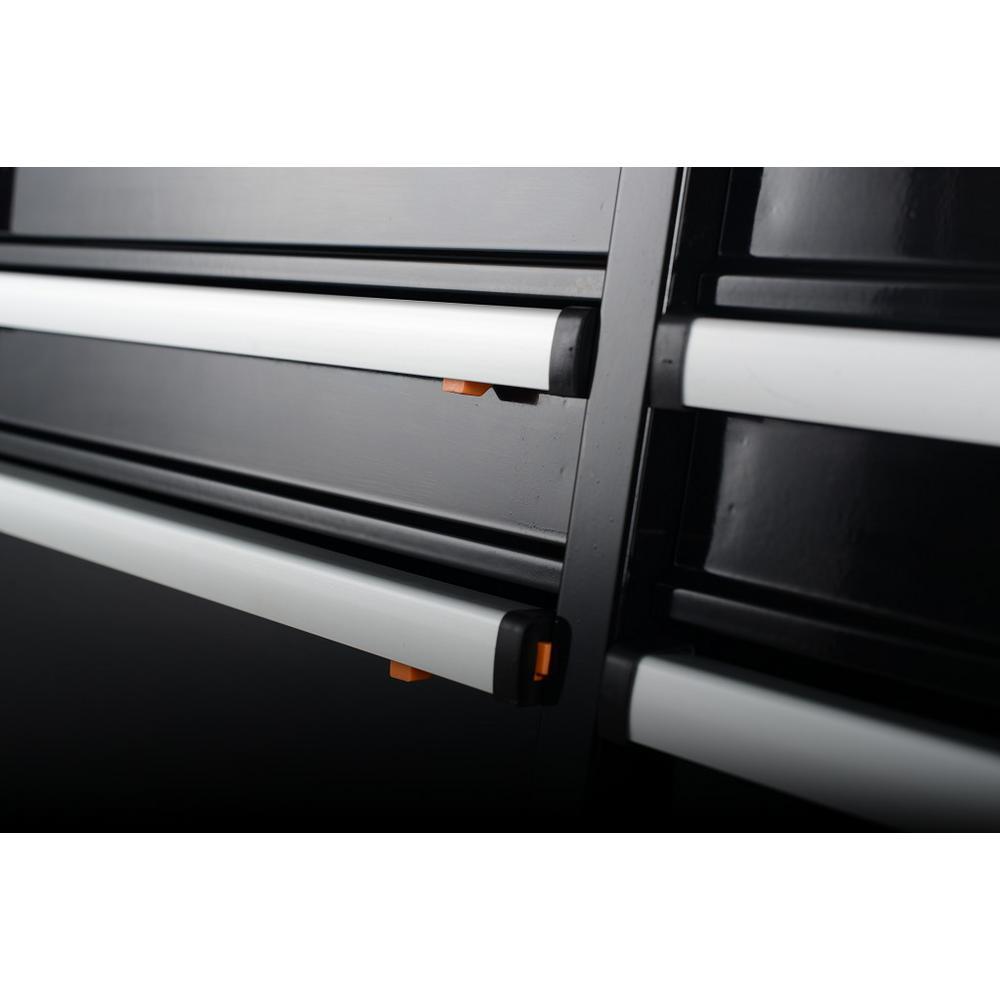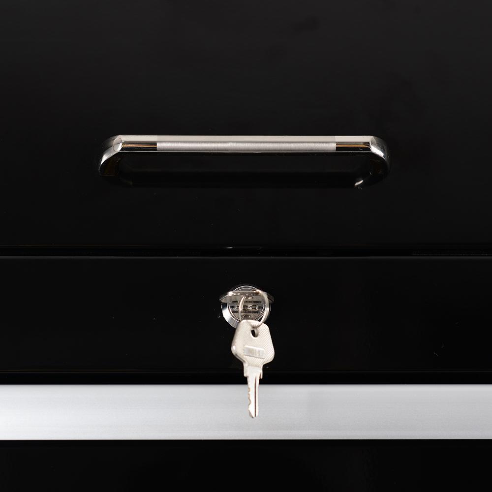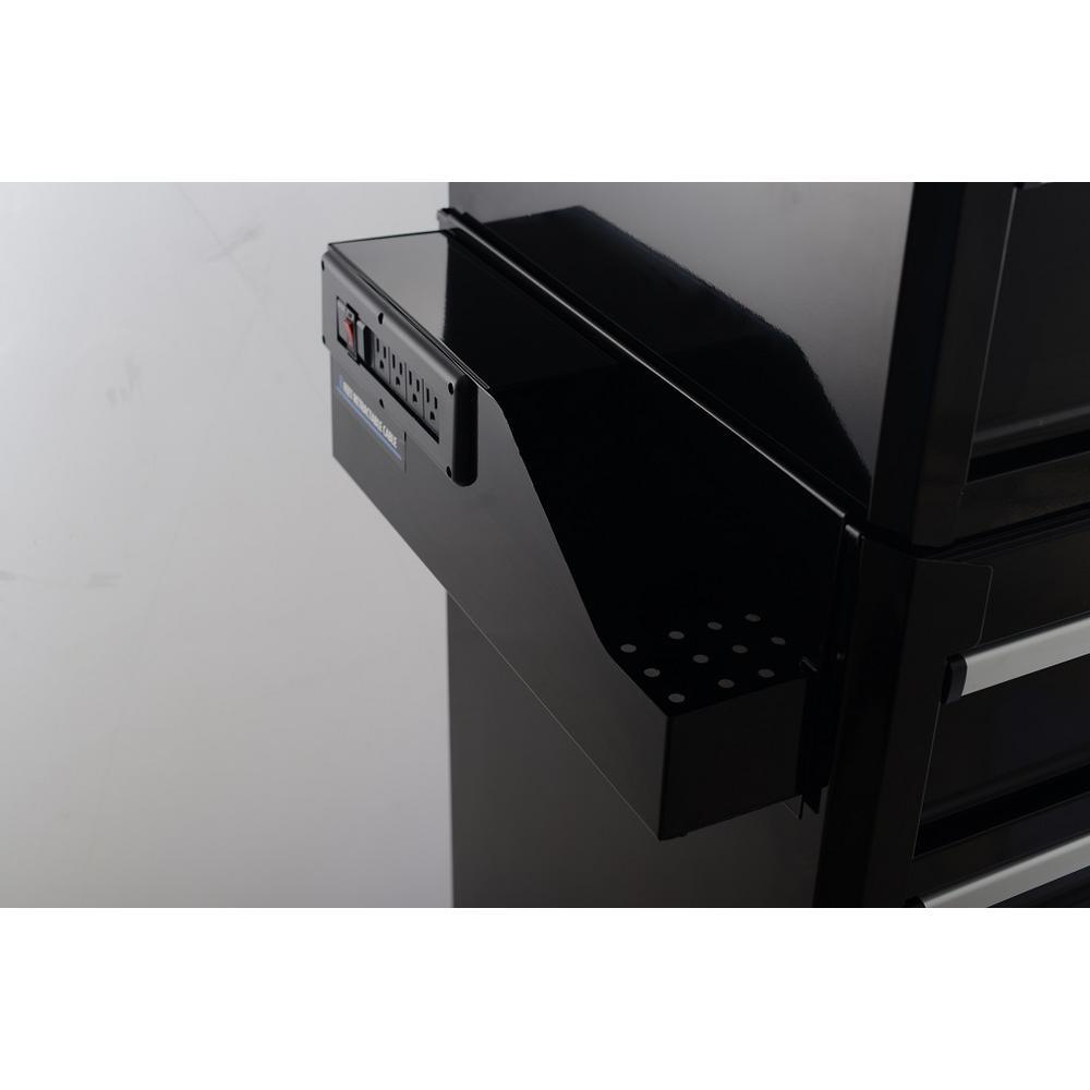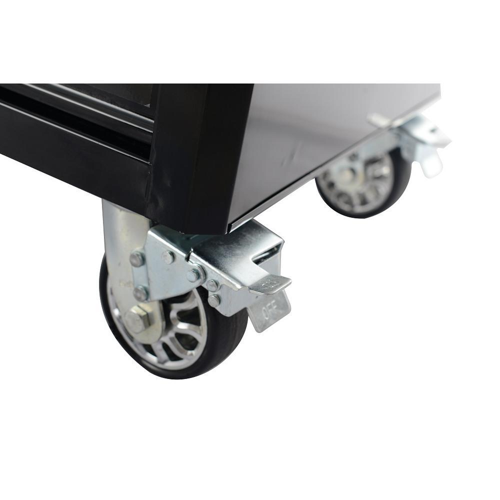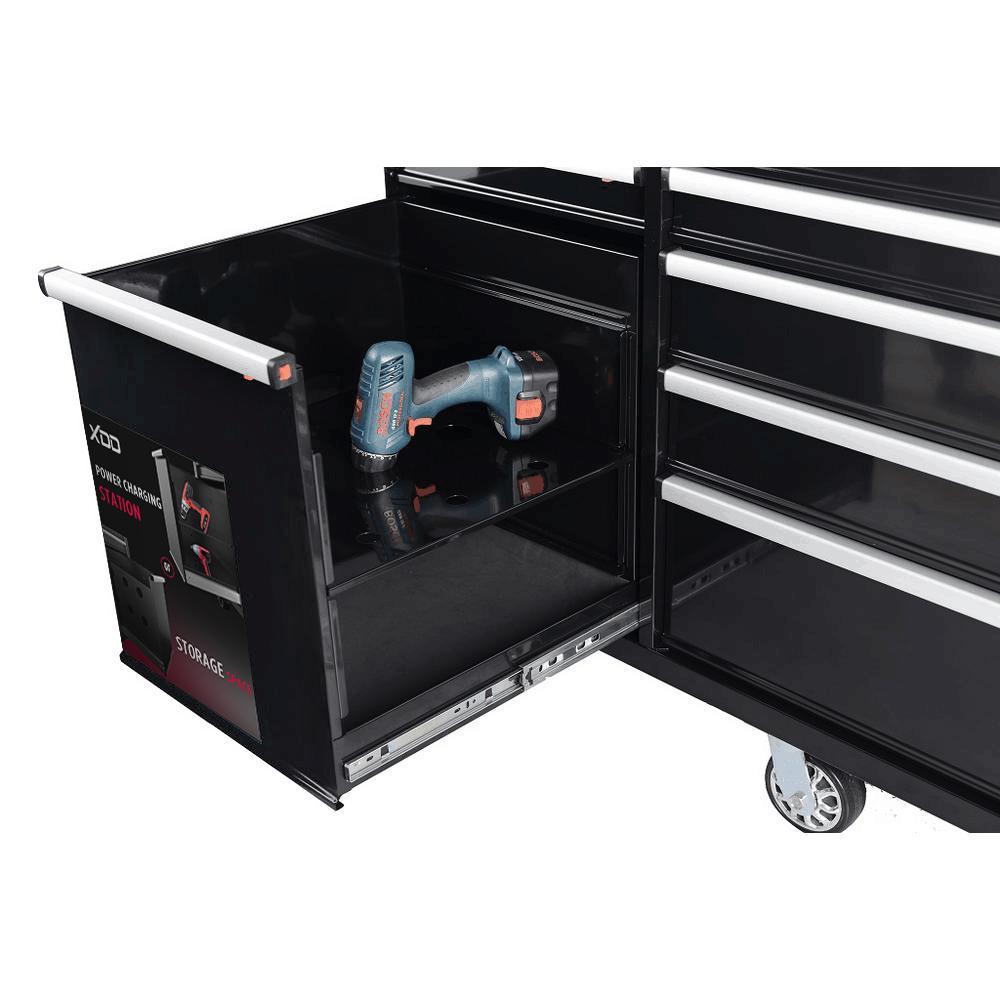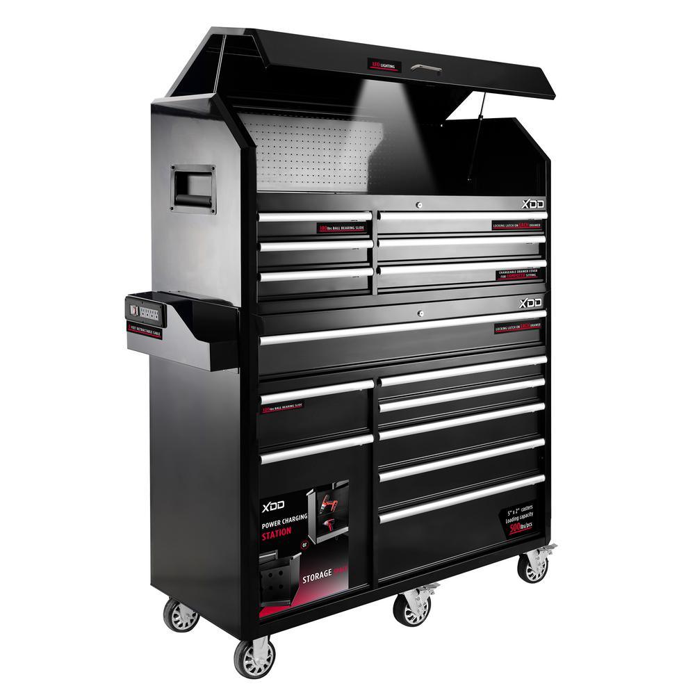 6 heavy-duty custom casters, 2 fixed and 4 swivel, so you can safely store your tool chest or easily move it to wherever you need, 1560 lb. capacity. Large lockable cabinet with adjustable shelf allows more flexibility to make power charging or store larger tools and equipment. Power strip with 2 USB ports included. 100 lb. capacity heavy duty ball-bearing drawer glides.