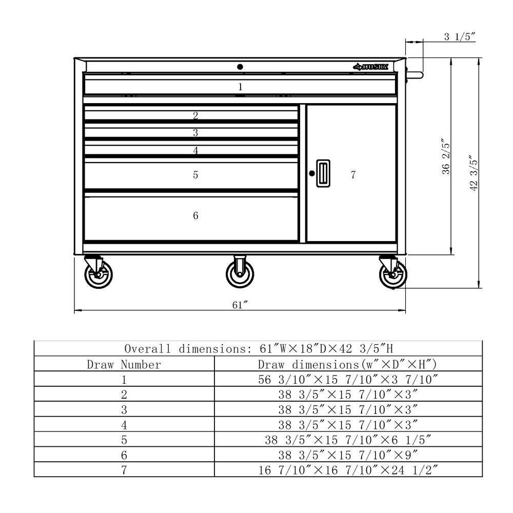 • Drawer dimensions: 1 top long drawer: 56.7 in. W x 15.8 in. D x 3.9 in. H, 3 left small drawers: 38.7 in. W x 15.8 in. D x 3.0 in. H, 1 left medium drawer: 38.7 in. W x 15.8 in. D x 6.1 in. H, 1 left large drawer: 38.7 in. W x 15.8 in. D x 9.3 in. H, 1 bulk storage area: 16.7 in. W x 17.0 in. D x 24.5 in. H