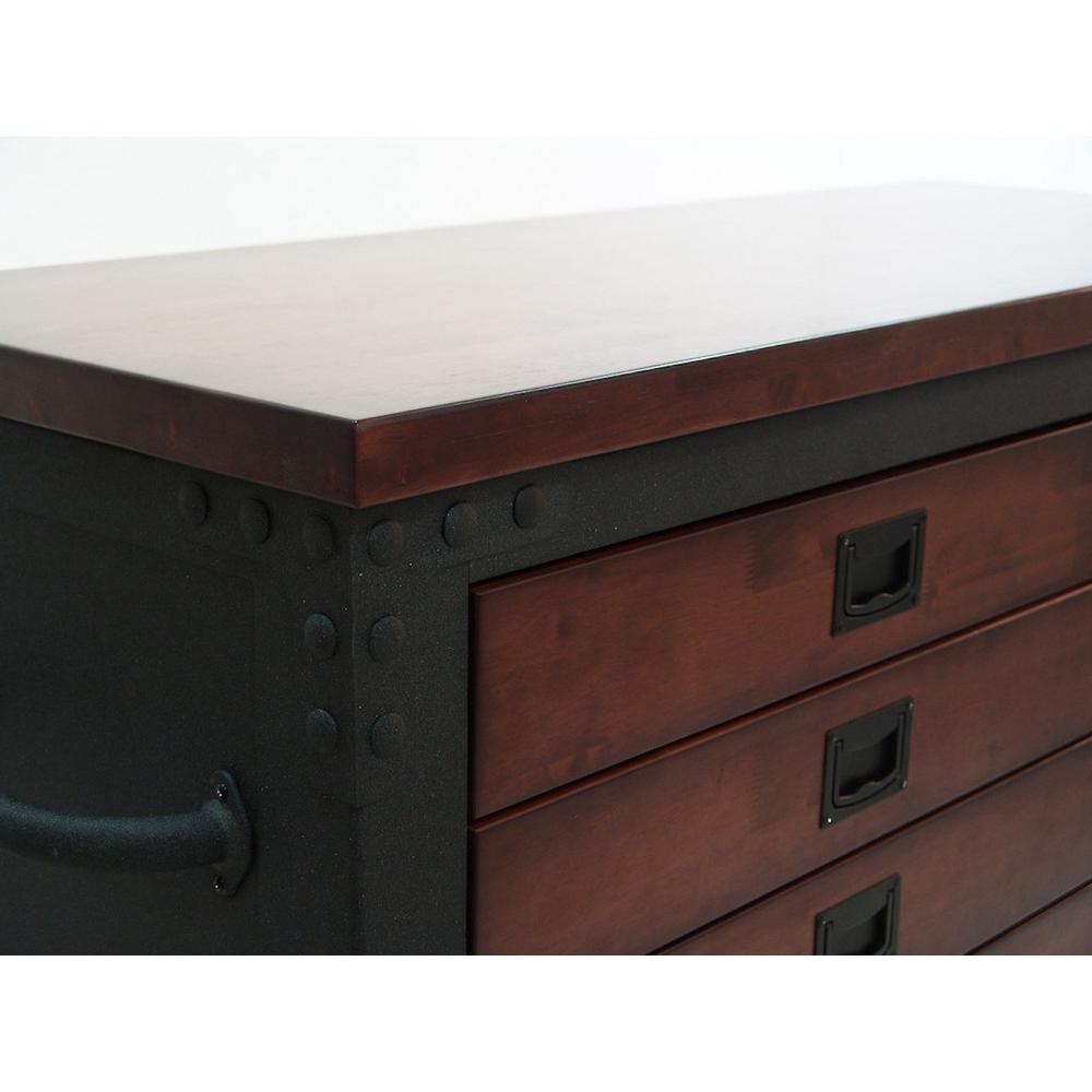 From stylish storage of dining room essentials to a convenient crafting stash on wheels, this sturdy, handsome industrial storage cart is surprisingly versatile. 5 slender drawers offer plenty of room, while a metal framework delivers the durability you need for-years of trouble-free use. Whether you just need a little more storage space for your favorite belongings or need a solution that's as much form as function, this cart fits the bill nicely. From the warm wooden drawer fronts to the cool grey metal of the surrounding frame, this is a modern cart with a vintage warehouse feel. Exposed rivet details at the corners add compelling design textures as well as strength to the overall design. Caster wheels on all 4 legs ensure consistent balance and support without anchoring this substantial industrial furniture-piece in 1 place. Simply grasp the handle and steer it into the spotlight or out from underfoot if guests are on the way: either way, it glides with a satisfying smoothness. Have it set up where you like it. Just use the lever-style locks on the 2 left wheels and the car won't roll or shift. 5 slender drawers are excellent for storing papers, serving trays and other large, flat items. Store board games or photo albums in the drawers for family fun night and extra-throw blankets in the cabinet - it makes an instant, convenient addition to your living room, den or study.
