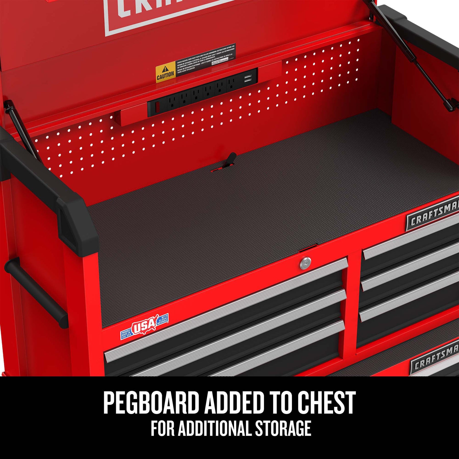 The bold red S2000 chest is a statement of precision and performance, turning your garage into a tailored studio. Its sleek soft-close drawers and pegboard back create rhythm and clarity, while the integrated power strip keeps the energy flowing. Style it atop a matching CRAFTSMAN cabinet for a cohesive, vertical storage tower. This is the essential foundation for a refined, hardworking space.