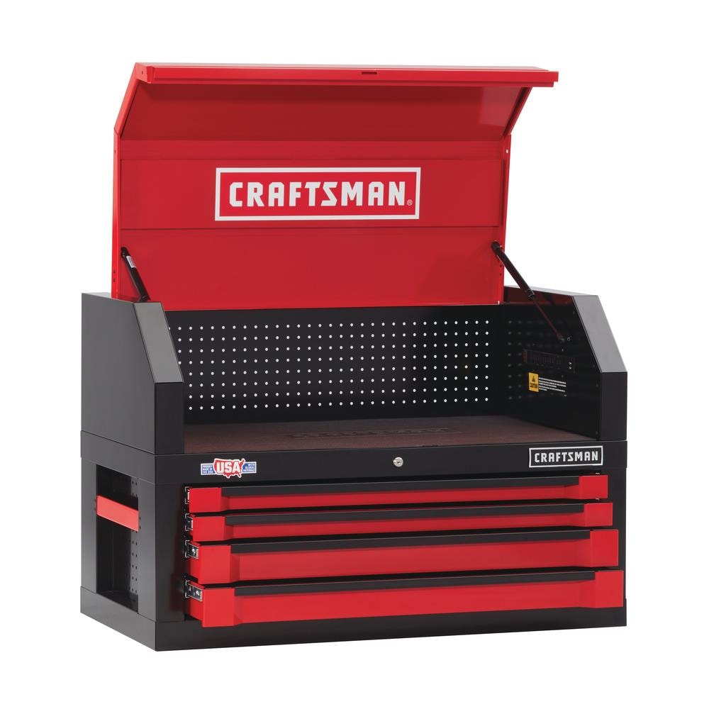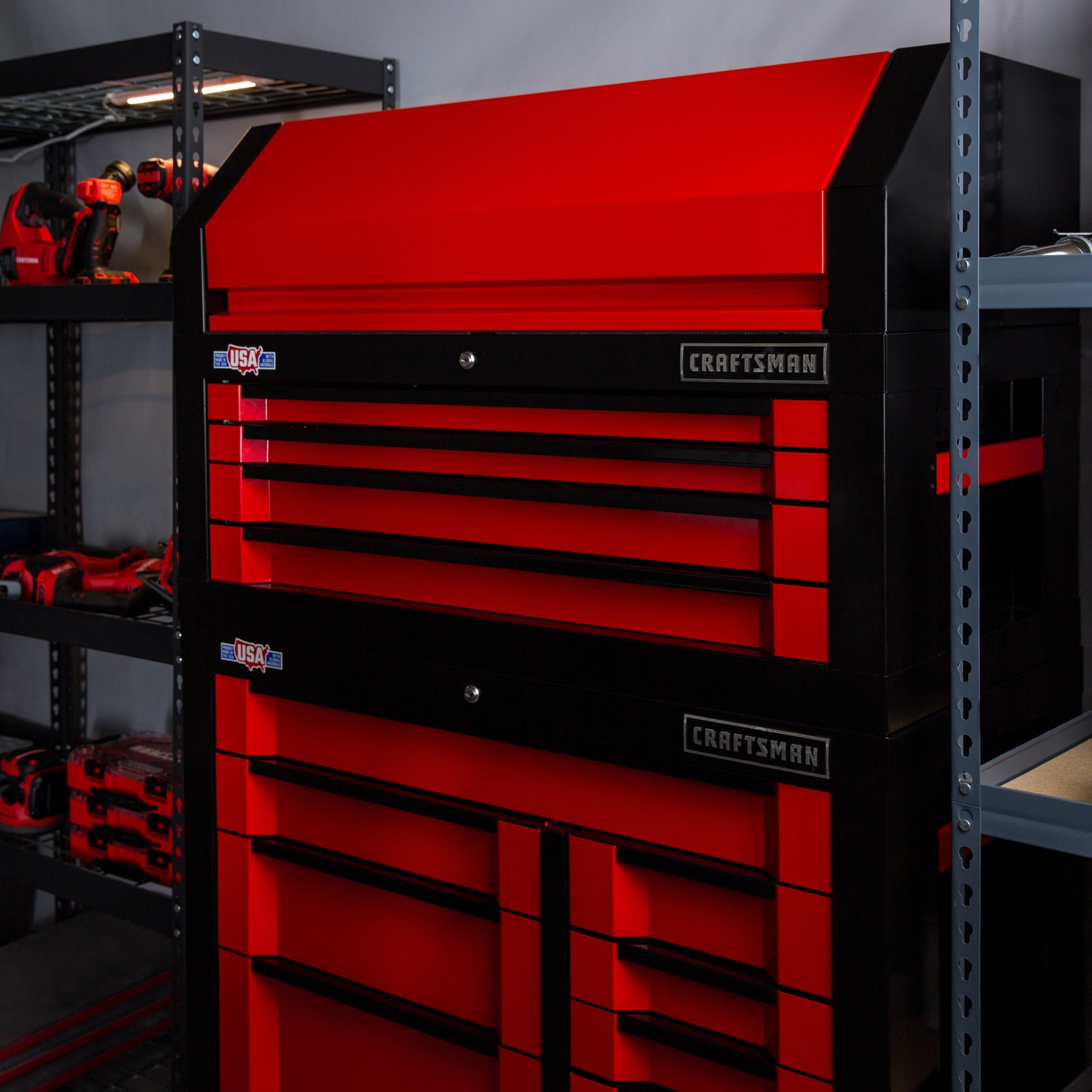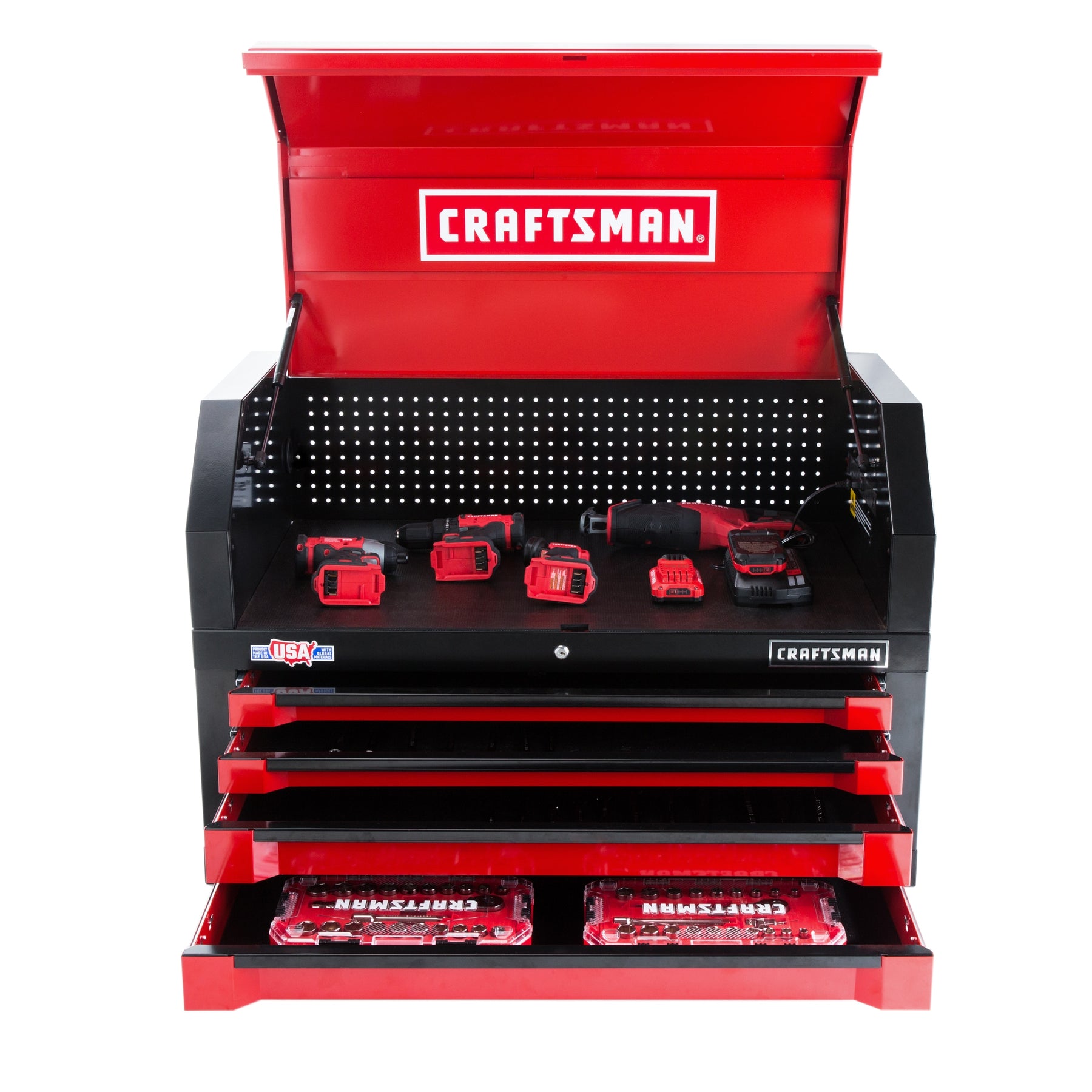 This tool chest anchors the garage with bold, architectural lines and a commanding red-and-black palette. The lift-top reveals a pegboard wall and a generous charging bay—form meeting function in a clean, modern silhouette. Style it with matching CRAFTSMAN power tools for a cohesive, high-performance workstation. It’s a luxe, hardworking centerpiece that elevates everyday projects.