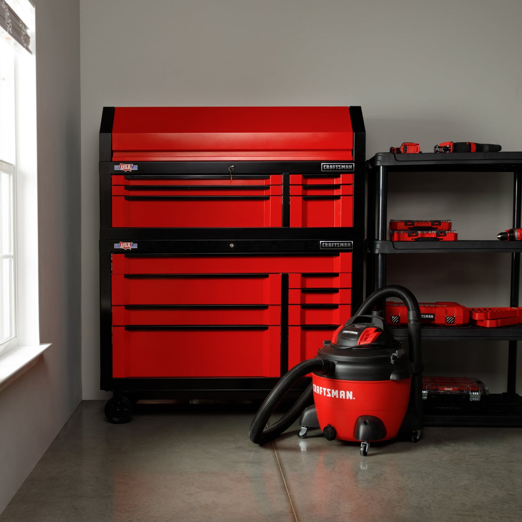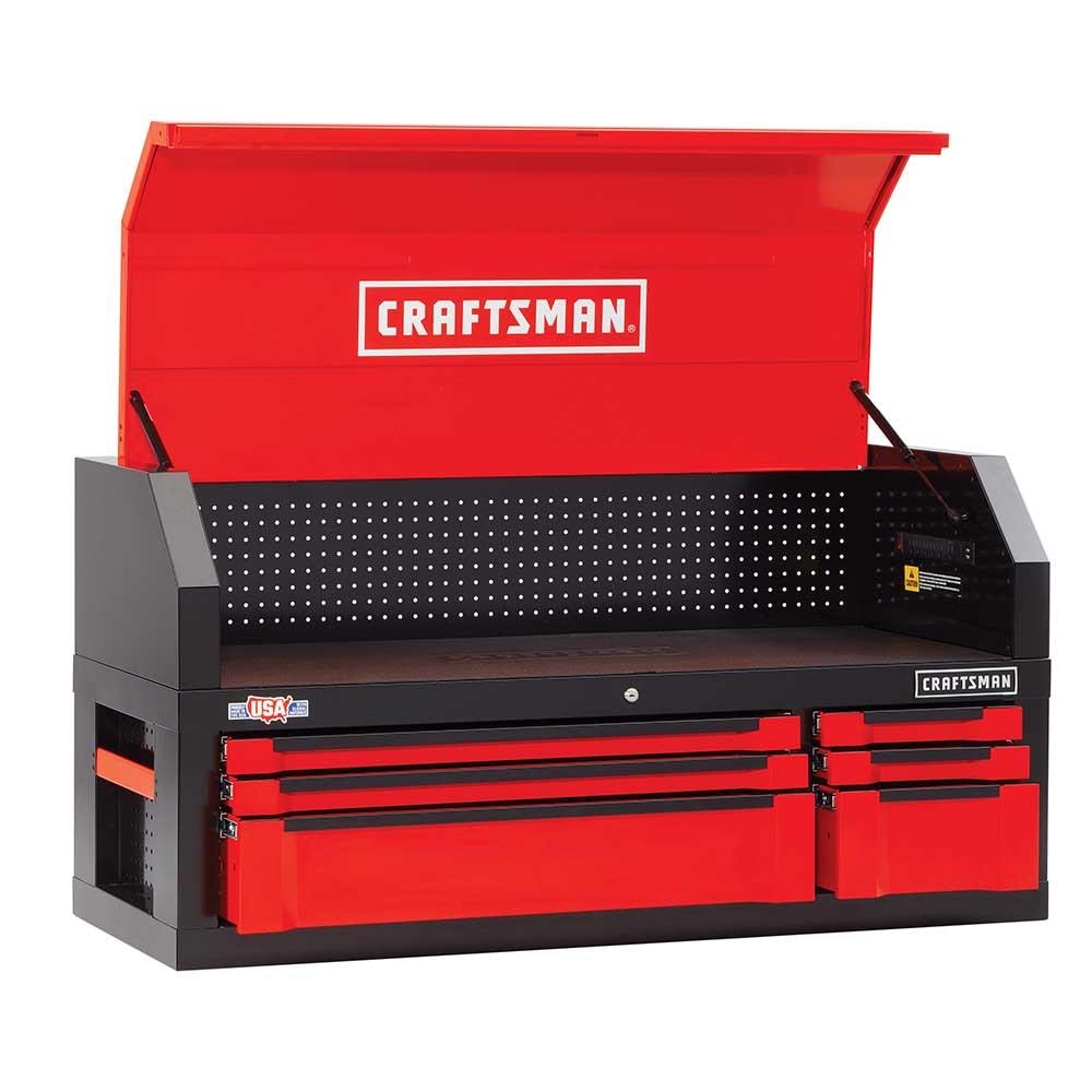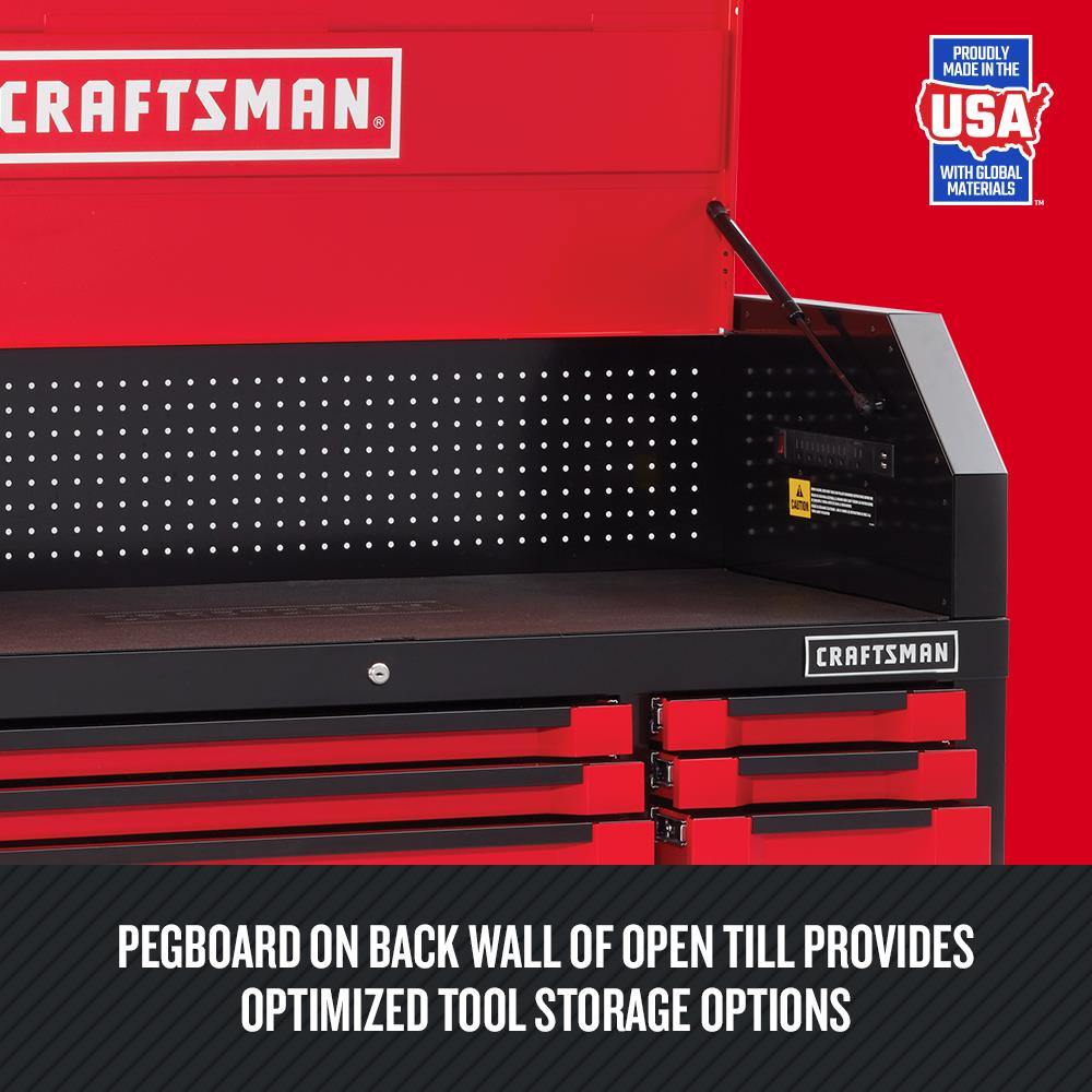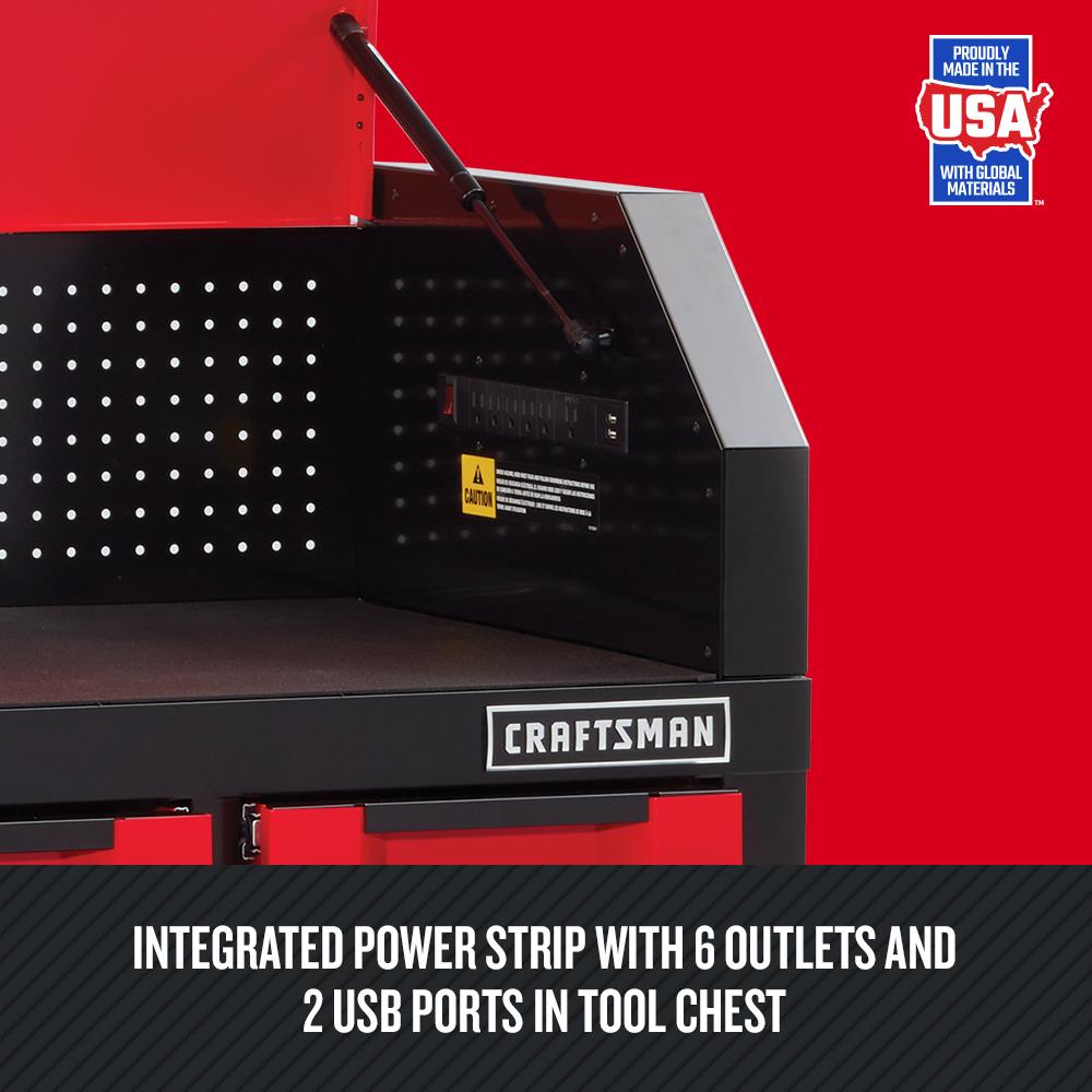 This CRAFTSMAN 3000 Series tool chest delivers rugged steel storage with a deep open till and pegboard back for organization. Built from 18-ga steel with full-extension, 120-lb drawer slides, it includes an integrated power strip with six outlets and two USB ports for convenient charging.