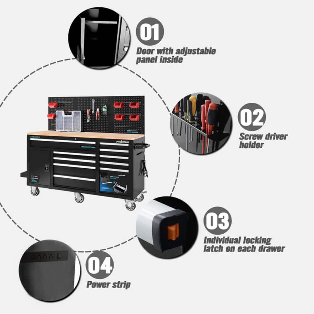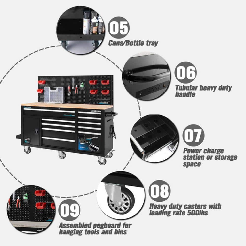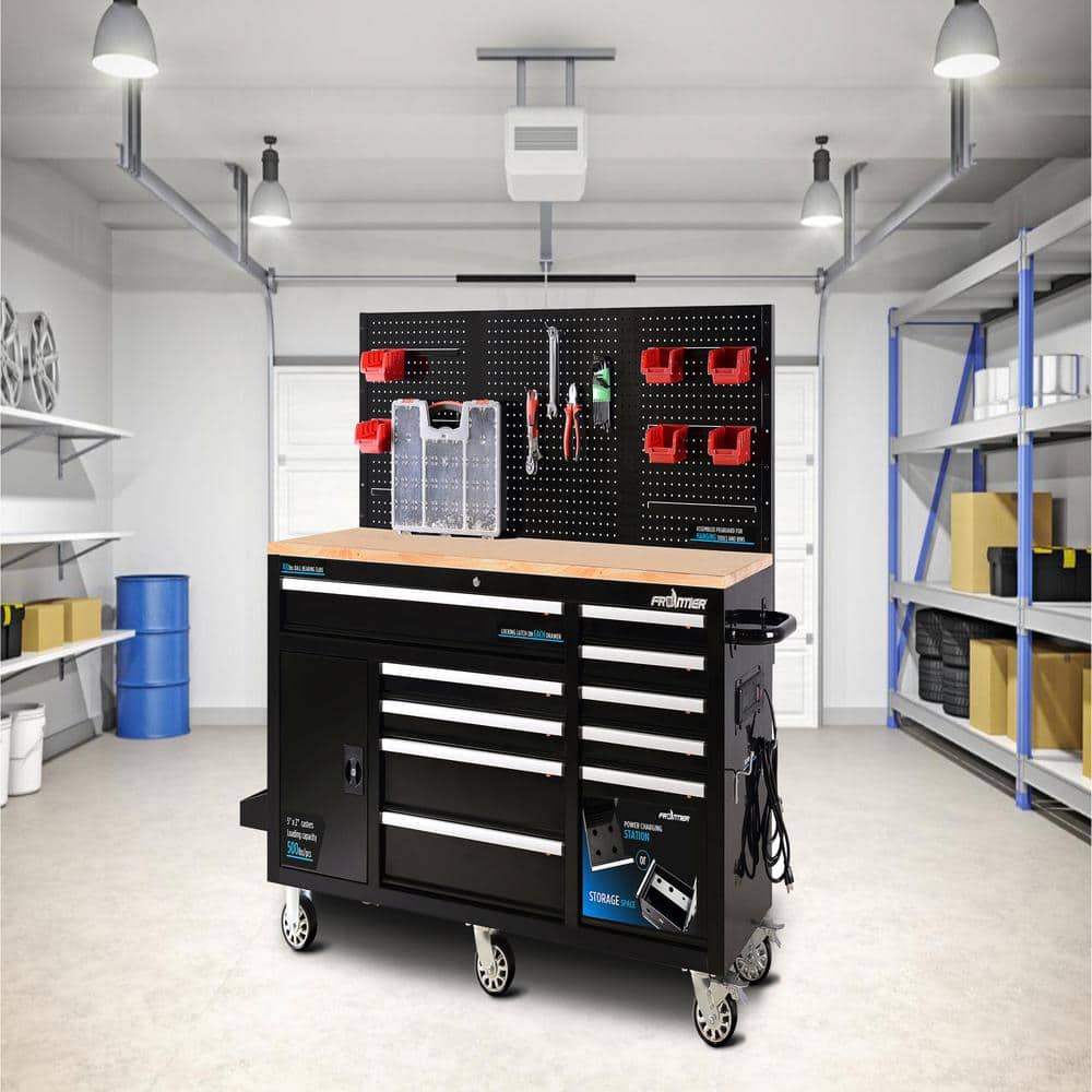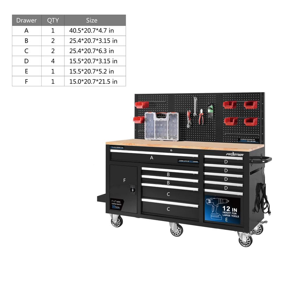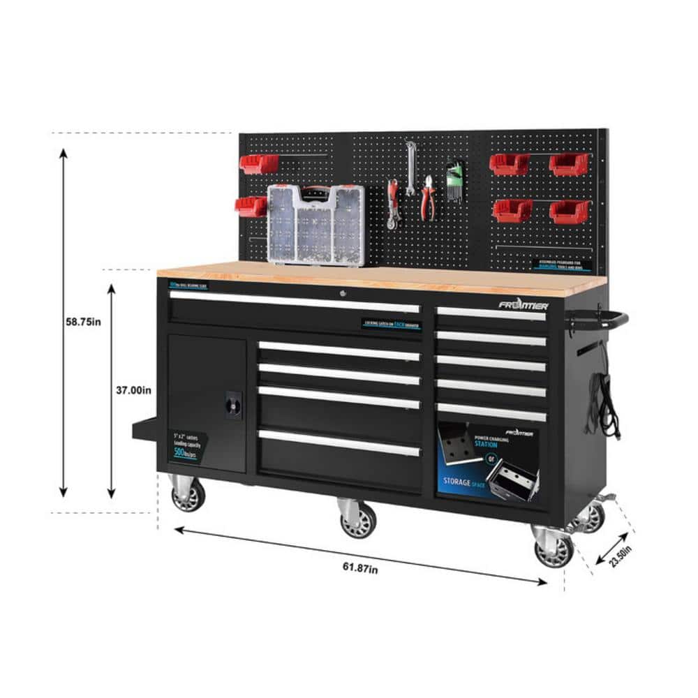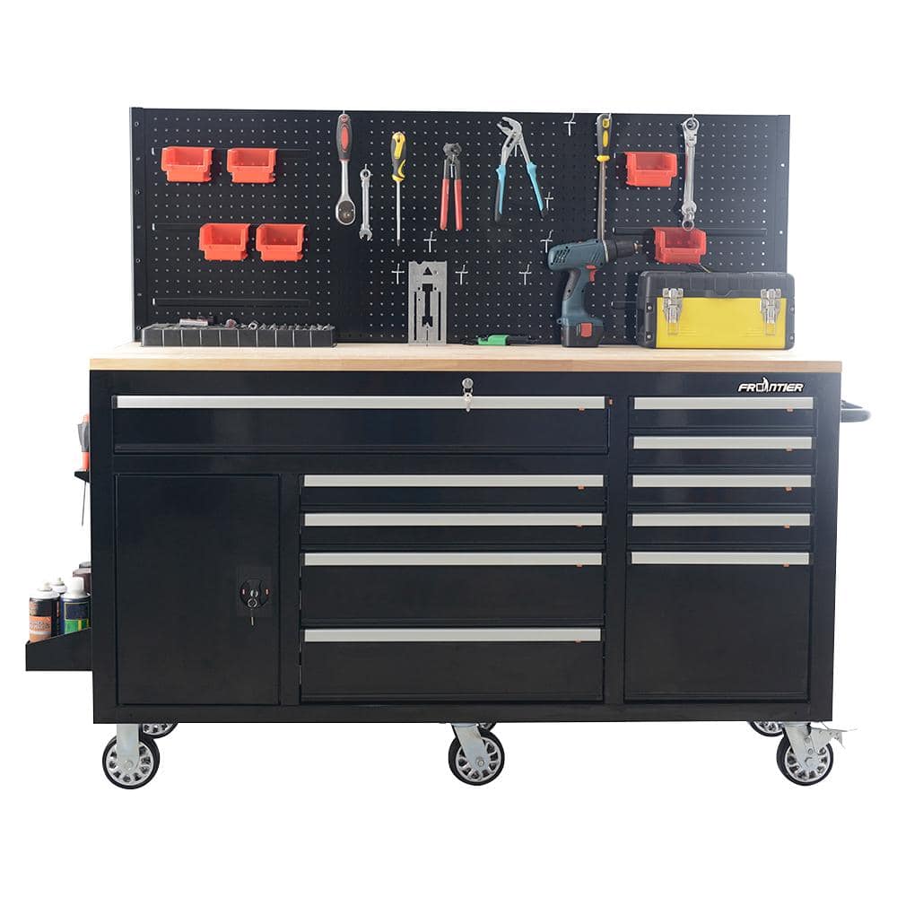 Frontier Heavy-Duty 62 in. W x 22 in. D 10-Drawer Black Tool Chest Mobile Workbench Cabinet with Pegboard Back Wall