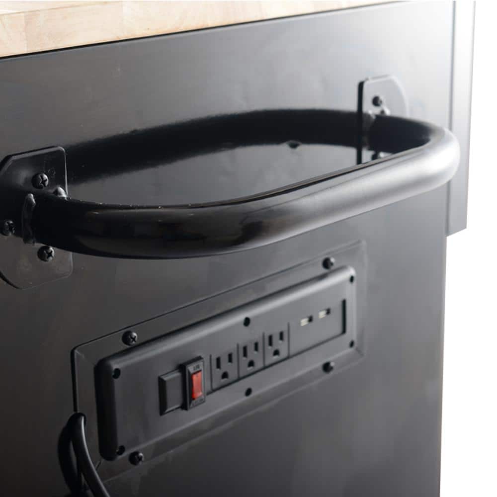 The Frontier Heavy-Duty Mobile Workbench combines robust construction with practical functionality, offering 62 inches of workspace. Featuring a 1-inch thick rubber wood top, integrated powerstrip, and a durable 19-gauge steel frame, this black workbench is designed for heavy workloads and easy mobility, capable of holding up to 2244 lbs.