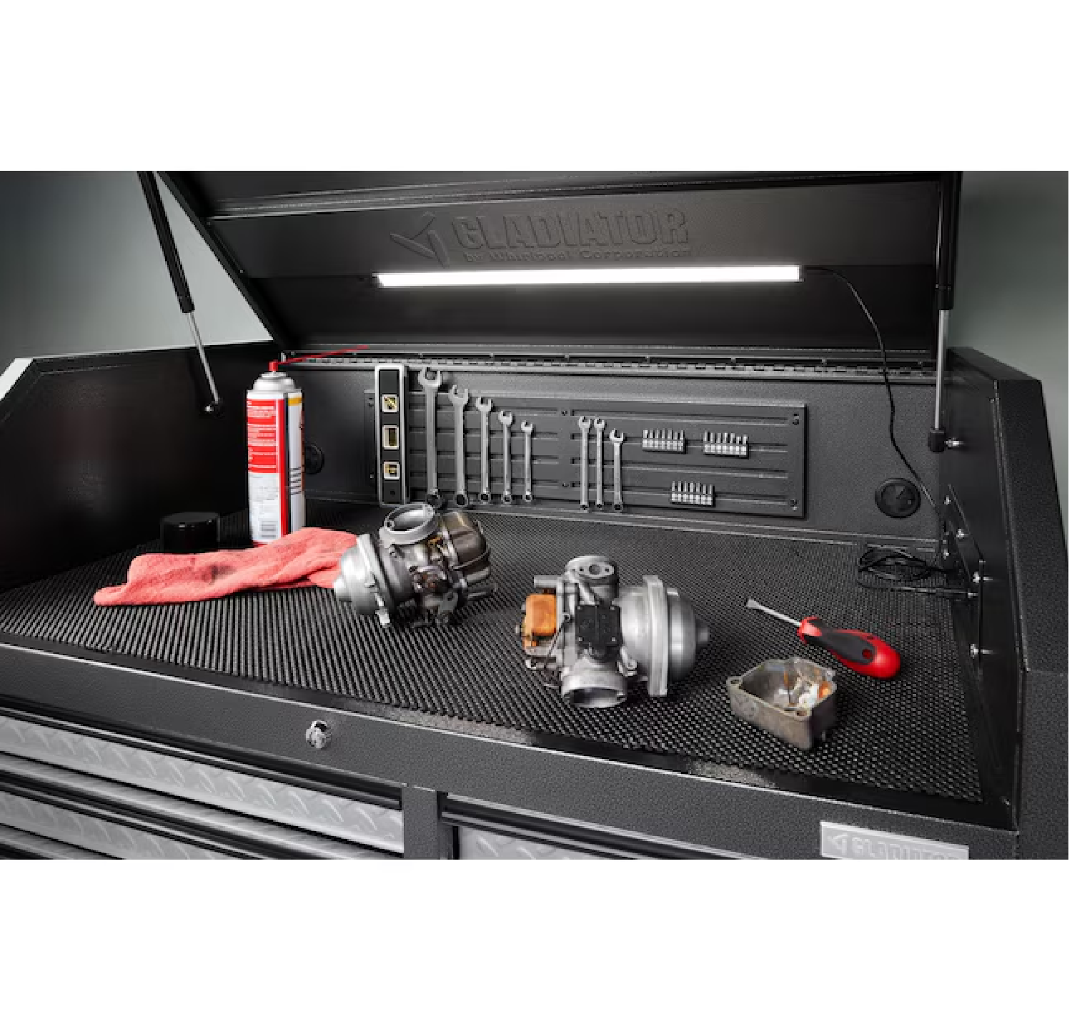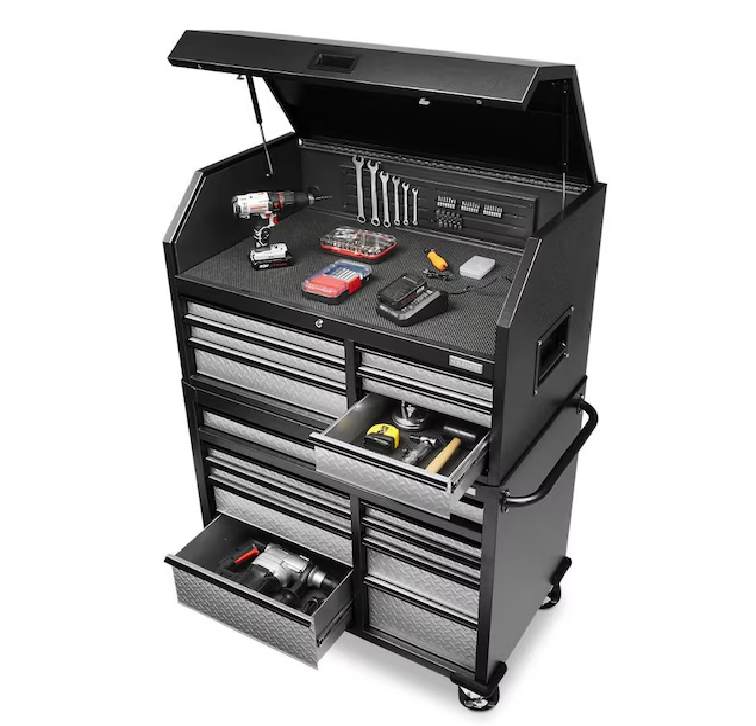 - This tool chest combo is engineered to provide ample storage and organization for all your tools, enhancing productivity and maintaining a tidy workspace. The integrated power strip and USB ports make it a hub for charging and powering your devices, while the portable LED light bar ensures visibility in any lighting condition.