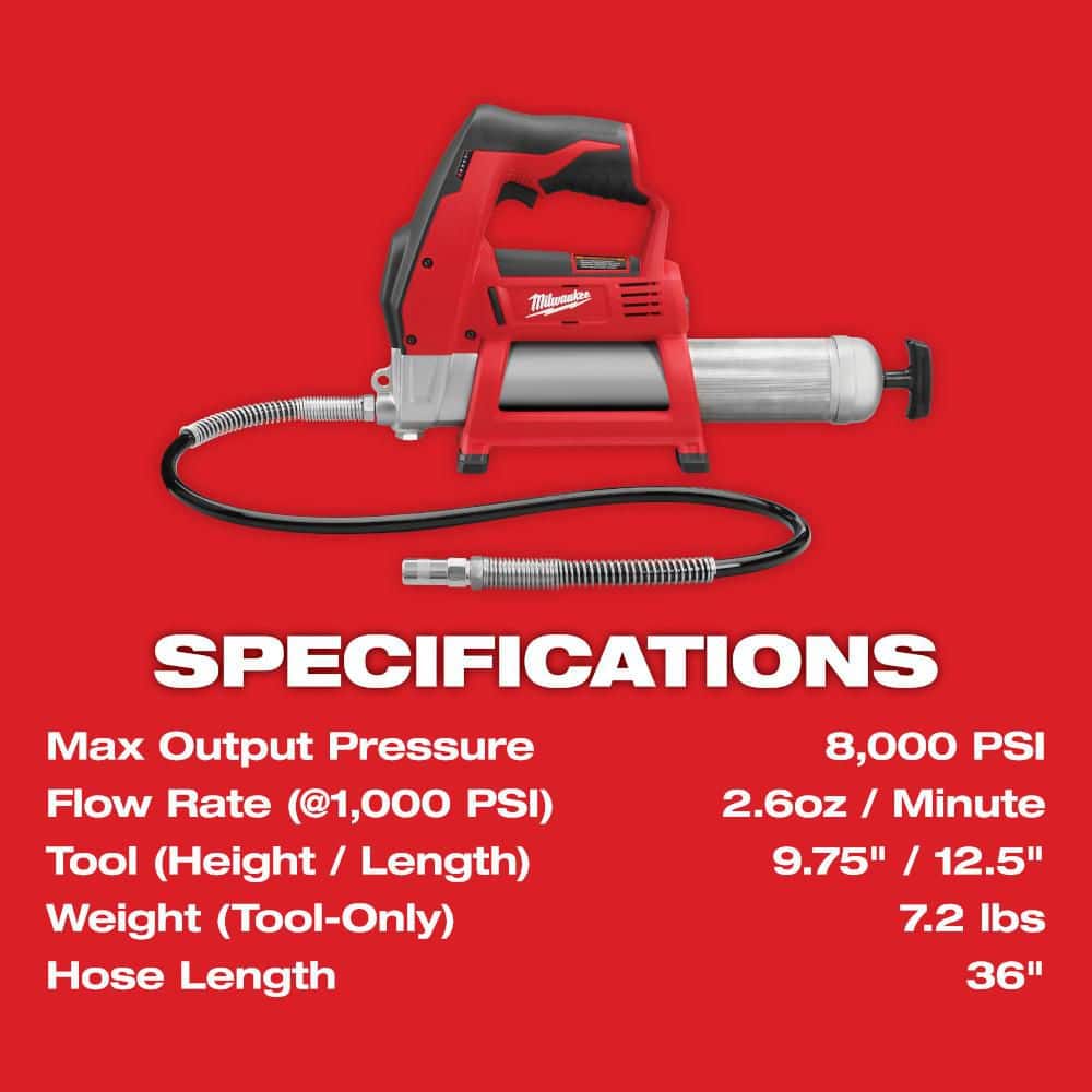 Milwaukee M12 12-Volt Lithium-Ion Cordless Grease Gun (Tool-Only), 8,000 PSI, 36-in Hose