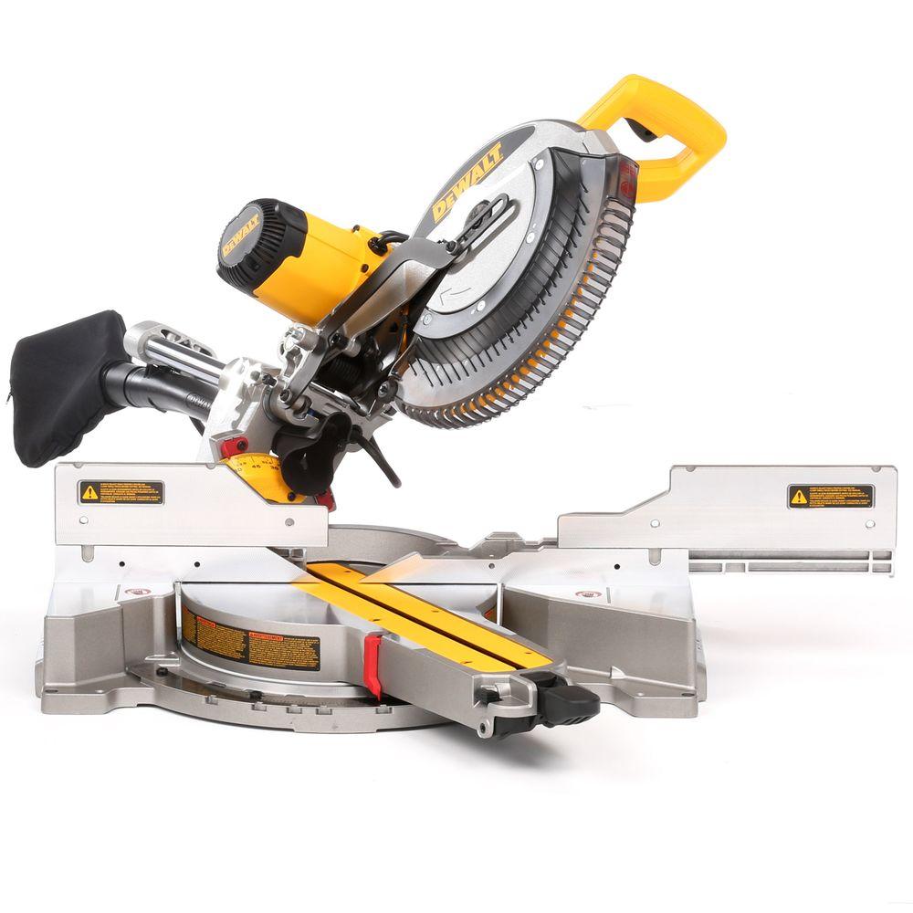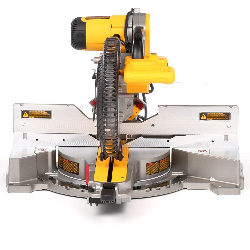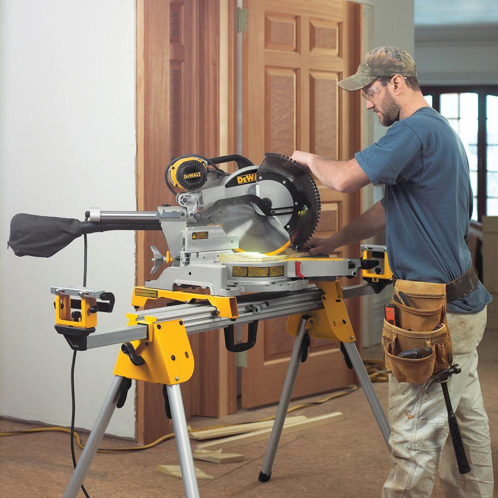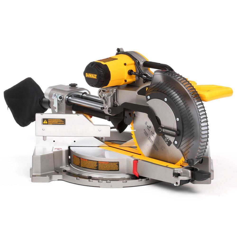 The DEWALT 15 Amp 12 in. Sliding Compound Miter Saw is driven by a powerful motor that delivers up to 3,800 RPM of cutting power. With extended bevel and miter capacities and tall sliding fences, this saw powers through dimensional lumber and molding at angles up to 50 Degree left and 60 degree right for versatility. 10 positive stops and an XPS LED make accurate cutting intuitive and easy and the gearbox and belt-drive design increases vertical cutting capacity. This saw comes conveniently supplied with a 12 in. carbide blade, blade wrench, vertical material clamp and dust bag. Miter Saw Stand (DWX723) included with purchase.