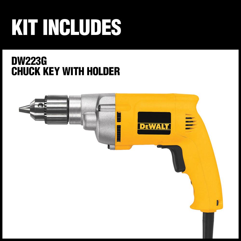 The 3/8 in. 7 Amp DW223G variable-speed reversing drill has the most power in its class and is a terrific tool for metal fabricators, cabinet shops, trim carpenters and general construction. It's capable of driving 3 in. screws or door hardware and spade bits into wood up to 1 in. thick. This unit can also drill up to 3-8 in. holes in light-gauge steel. The metal gear housing and helical-cut, heat-treated steel gears add durability and provide longer gear life. The 360 degree side handle can be adjusted for greater user control. The drill also has a grounded plug for increased safety.