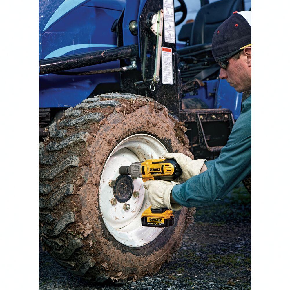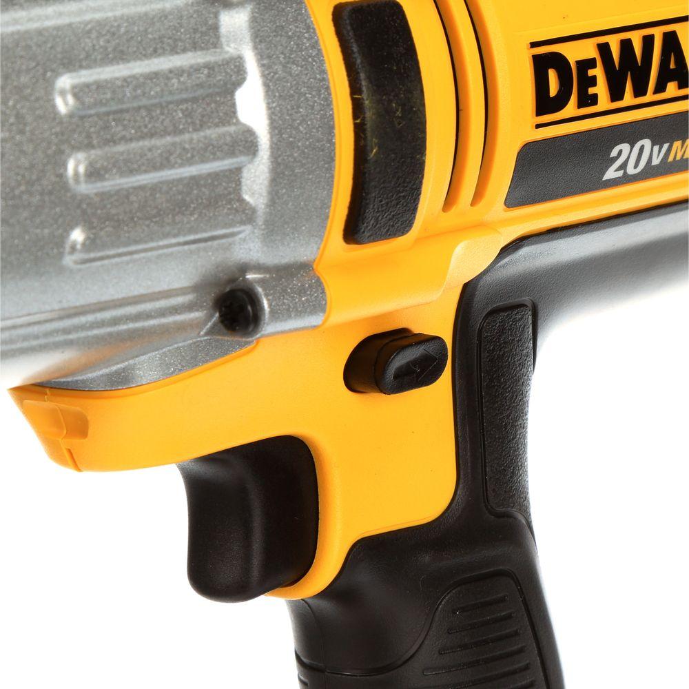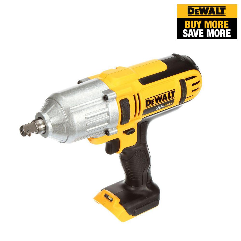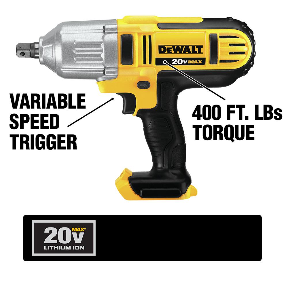 The DEWALT 20-Volt Max Lithium-Ion 1/2 in. High Torque Impact Wrench with Detent Pin (Tool-Only) is designed for mechanical contractors, plumbers, automotive mechanics, maintenance and repair professionals and remodelers who demand a tool for difficult fastening applications, such as driving and removing fasteners or nuts and bolts in wood, metal and concrete. Powerful with 400 ft. lbs. of torque, this impact wrench also has a variable speed trigger with an electric brake for added control and delivers 1500 RPM and 2300 IPM. Comfortable to use and easy to control with its ergonomic handle, this impact wrench is also strong and reliable for long-lasting use on the jobsite or for DIY projects around your home.