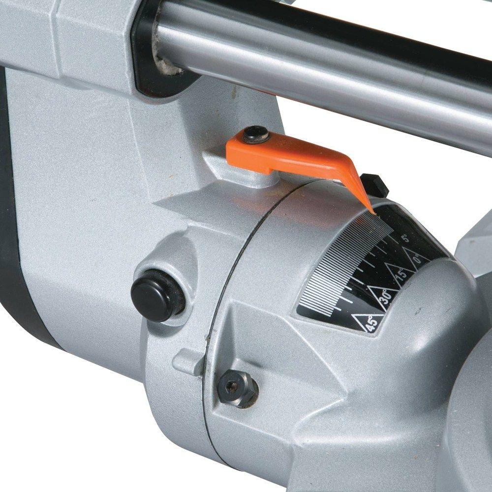 • Dual rear handle bevel lock is easily accessible and adjusts 0°- 48° (left) and 0°- 5° (right) with positive stops at 0°, 22.5°, 33.9°, 45° (right)