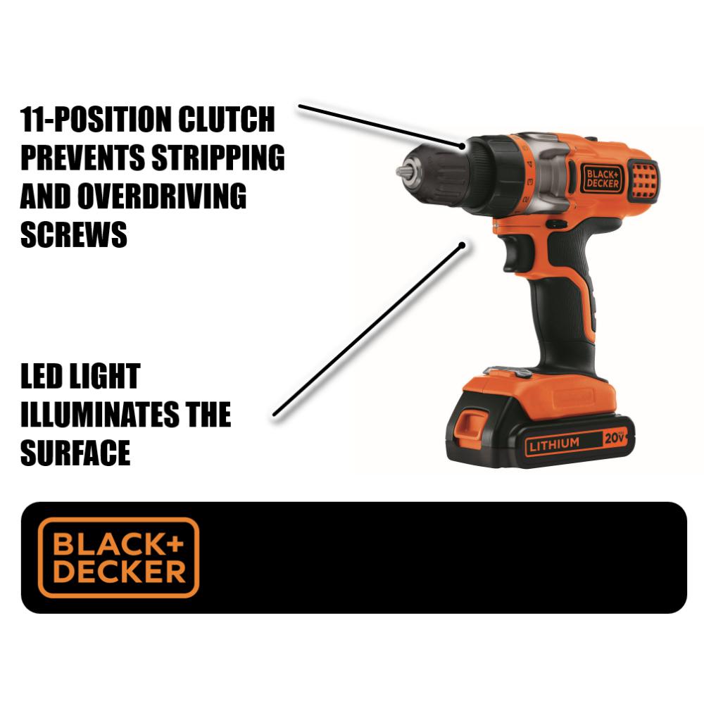 The BLACK+DECKER 20-Volt Max Lithium-Ion Drill/Driver (LDX220C) is powered by a lithium-ion battery that holds a charge up to 18 months, always ready when you need it. Providing an extra level of control, the 11-position clutch is designed to prevent stripping and overdriving screws. The drill also features an LED work light that illuminates the work surface for easier drilling in dark spaces.