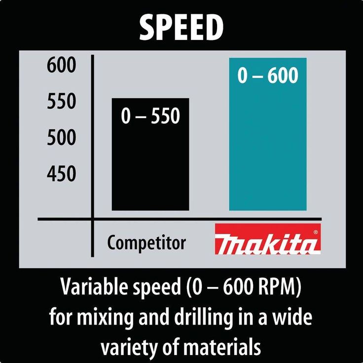 • Variable speed (0 and 600 RPM) for mixing and drilling in a wide variety of materials