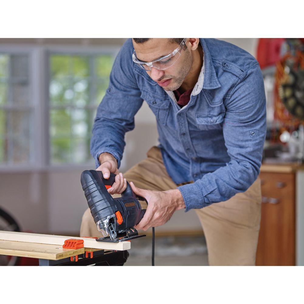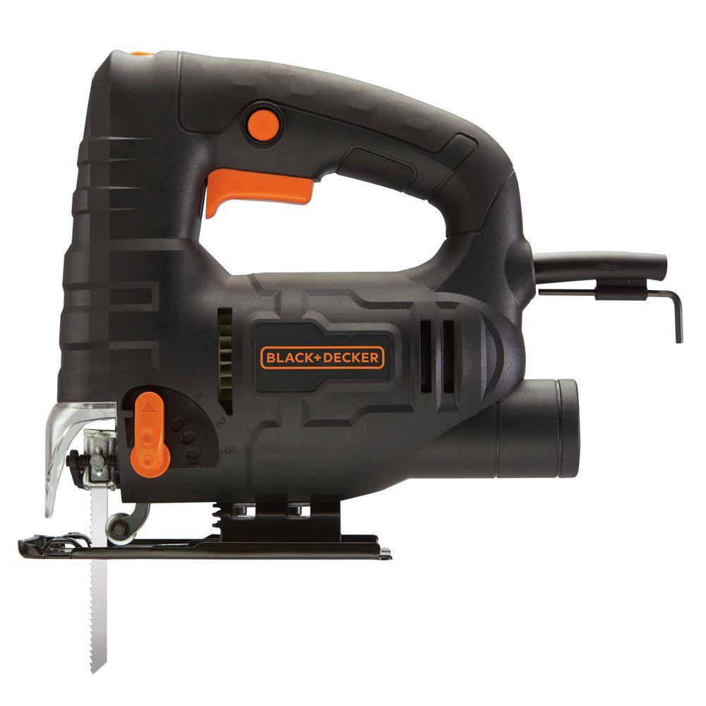 Compact and lightweight, the BLACK+DECKER BDEJS4C electric jigsaw has power to complete a variety of cuts. This saw features a 4 Amp motor for aggressive cuts in an array of materials. The tilting base plate allows for bevel cuts up to 45°.