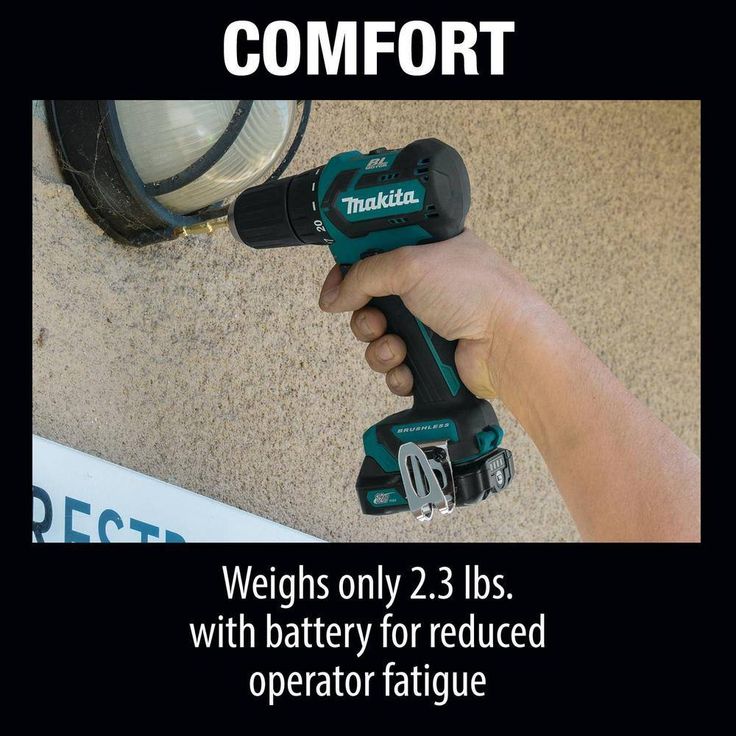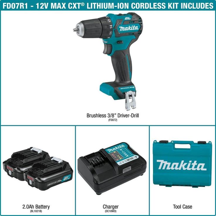 The Makita 12-Volt MAX CXT Lithium-Ion Brushless Cordless 3/8 in. Driver-Drill Kit delivers power and speed in an ultra-compact size for efficient drilling, driving and fastening. With Makita 12-Volt MAX CXT Lithium-Ion slide-style batteries, users get superior balance and ergonomics over pod-style batteries. For added convenience the batteries include an on-board LED charge level indicator. The FD07R1 weighs only 2.3 lbs. (with 2.0Ah battery), and delivers 280 in. lbs. of MAX Torque. It's an ideal solution for users seeking a more compact driver-drill with less weight and for applications in tight spaces. For longer run time, 12-Volt MAX CXT cordless tools are also compatible with the 12-Volt MAX CXT Lithium-Ion 4.0Ah battery (BL1041B). 12-Volt MAX CXT Lithium-Ion batteries are engineered with a Battery Protection Circuit that protects against overloading, over-discharging and over-heating. It's part of the expanding 12-Volt MAX CXT series, combining performance with superior ergonomics in a compact size.