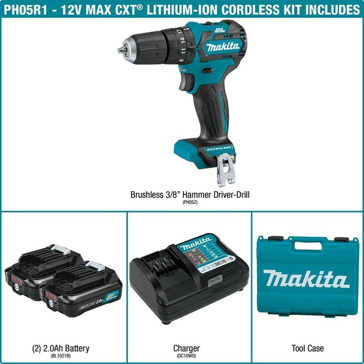 The Makita 12-Volt MAX CXT Lithium-Ion Brushless Cordless 3/8 in. Hammer Driver-Drill Kit delivers power and speed in an ultra-compact size for efficient drilling, driving and fastening. With Makita 12-Volt MAX CXT Lithium-Ion slide-style batteries, users get superior balance and ergonomics over pod-style batteries. For added convenience the batteries include an on-board LED charge level indicator. The PH05R1 weighs only 2.4 lbs. (with 2.0Ah battery) and delivers 280 in. lbs. of Maximum Torque. It's an ideal solution for users seeking a more compact driver-drill with less weight and for applications in tight spaces. For longer run time, 12-Volt MAX CXT cordless tools are also compatible with the 12-Volt MAX CXT Lithium-Ion 4.0Ah battery (BL1041B). 12-Volt MAX CXT Lithium-Ion batteries are engineered with a Battery Protection Circuit that protects against overloading, over-discharging and over-heating. It's part of the expanding 12-Volt MAX CXT series, combining performance with superior ergonomics in a compact size.