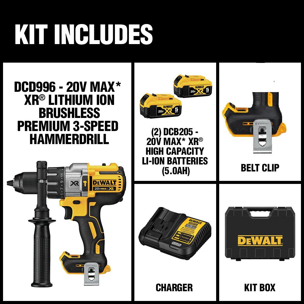The DEWALT DCD996P2 Hammer drill driver is ideal for most drilling and hammering applications. This hammer drill features an innovative brushless design. The 20-Volt Max Lithium-Ion battery packs are designed for long runtime and shelf life.