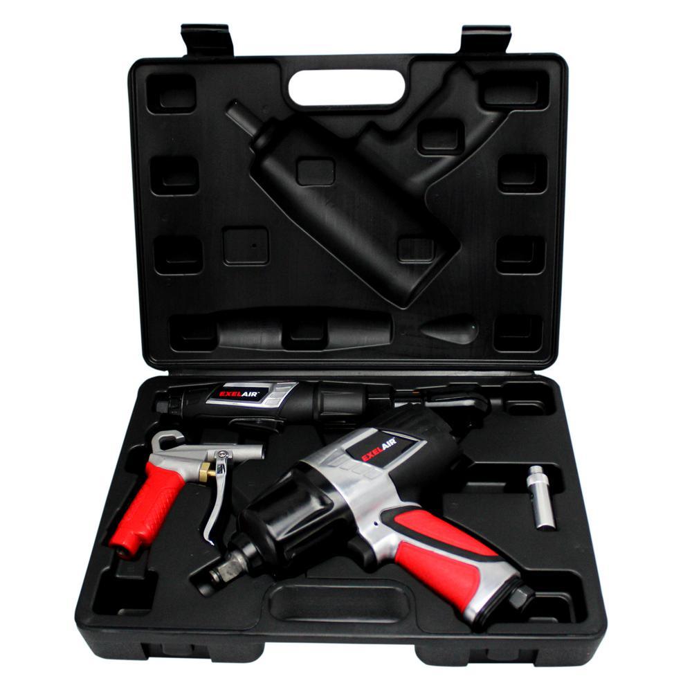 EXELAIR by Milton, 3 piece Air Compressor Tool Kit is ideal for do-it-yourself, to professional, to industrial applications. Equipped with an air impact wrench, air ratchet wrench and heavy-duty blow gun. The 3-Piece Air Compressor Performance Tool Kit comes with a 3-year limited warranty on tools.