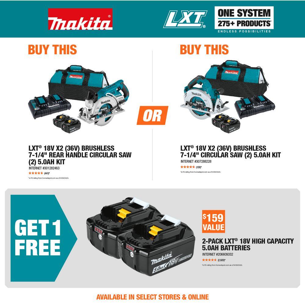18-Volt X2 LXT Lithium-Ion (36-Volt) Brushless Cordless Rear Handle 7-1/4 in. Circular Saw w/BONUS 5.0Ah Battery 2 Pack