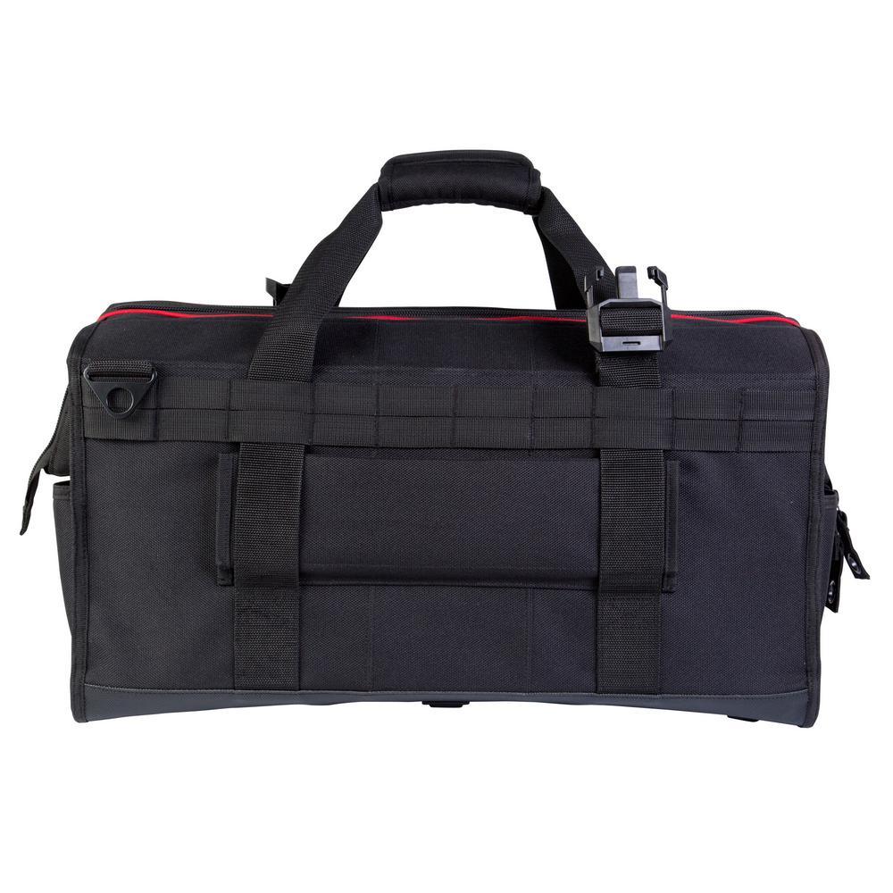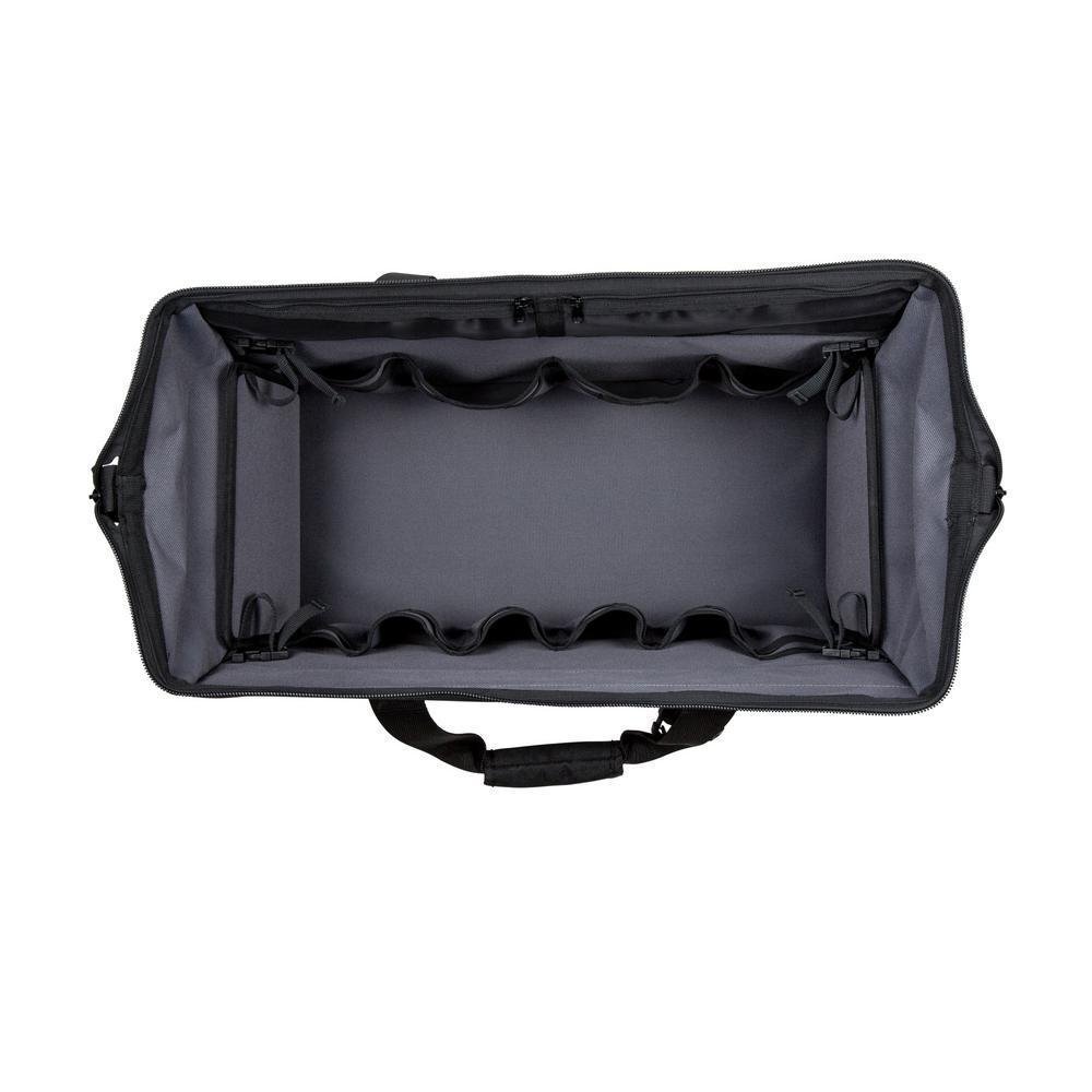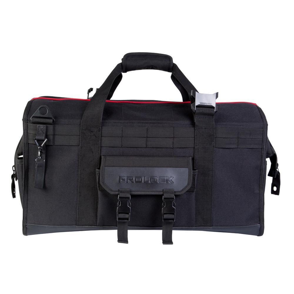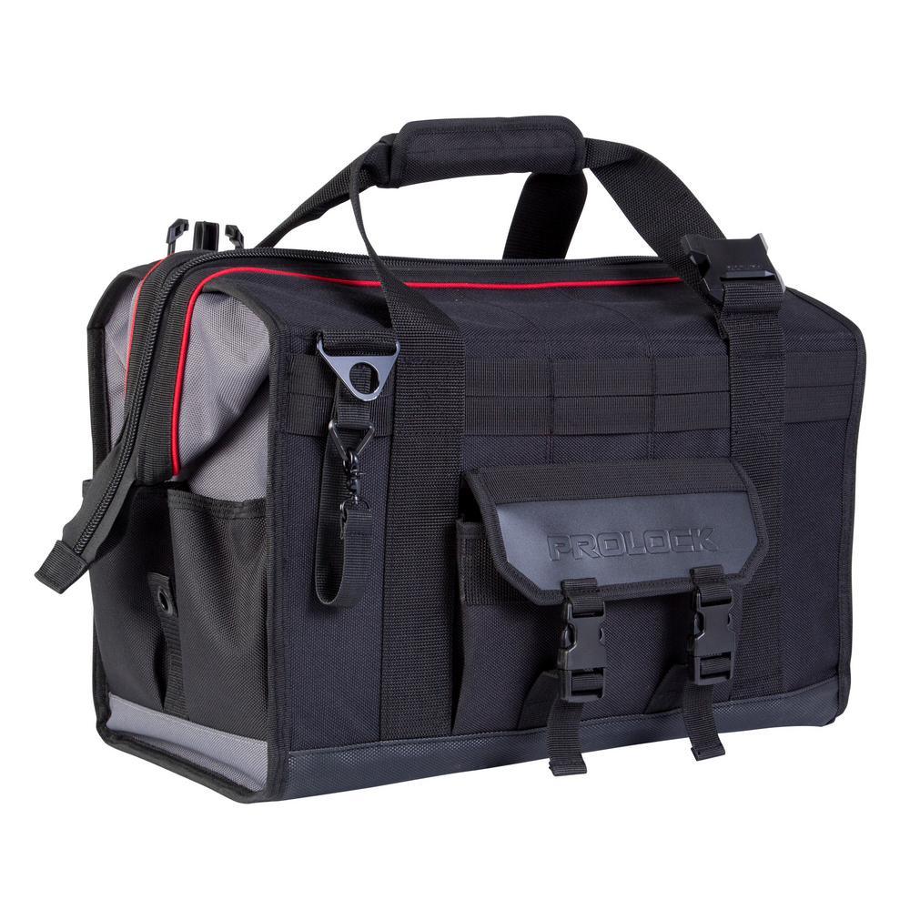 Safely and securely store and organize your tools on the job and between jobs with the PROLOCK PLB024 (93293) 24 in. 23-Pocket Broad Mouth Tool Bag. The wide opening mouth design allows for unrestricted access to the interior's entire 45L capacity to store even larger tools easily. The durable and abrasion resistant 1200 denier polyester fabric construction is reinforced with double stitched binding edges and rigid PVC liners that provide the structure and puncture resistance of a metal tool box with the collapsibility and light weight of a canvas tool bag. An outer PVC liner and feet on the bottom of the bag provide protection against moisture to help keep tools and contents dry. 23 total pockets and 24 tool loops provide ample storage for a wide variety of tools and include 2 interior zippered mesh pockets, an exterior compartment with a buckle secured flap, a tape strap and a tension tightened bubble level storage sleeve. Nickel plated steel D-rings provide secure anchors for the included shoulder strap and additional buckles allow the optional use of a PROLOCK work belt as a shoulder strap when headed to the job site then detach it for regular use. MOLLE style exterior loops allow the attachment of PROLOCK clips for mounting additional tool pouches and accessories. Includes 1 steel quick release PROLOCK pouch clip, a padded shoulder strap and a sling belt with plastic buckle.
