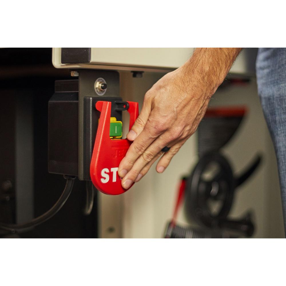 The JET ProShop Table Saw offers features you expect from a high-end cabinet saw, in the compact design of a contactor-style machine. The redesigned transparent blade guard has independent leaves and the quick release riving knife reduces chance of kickback. The exclusive ProShop fence system is available in 30 or 52 rip capacity.