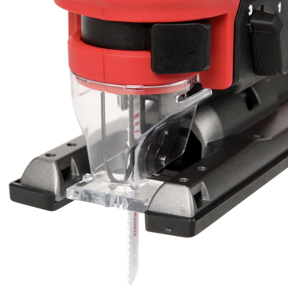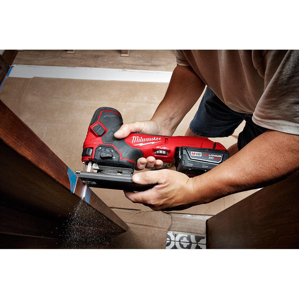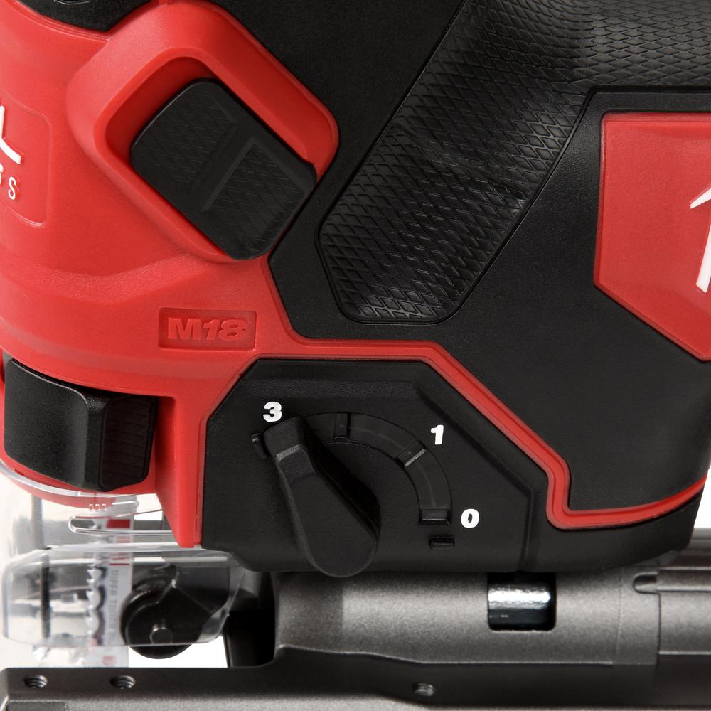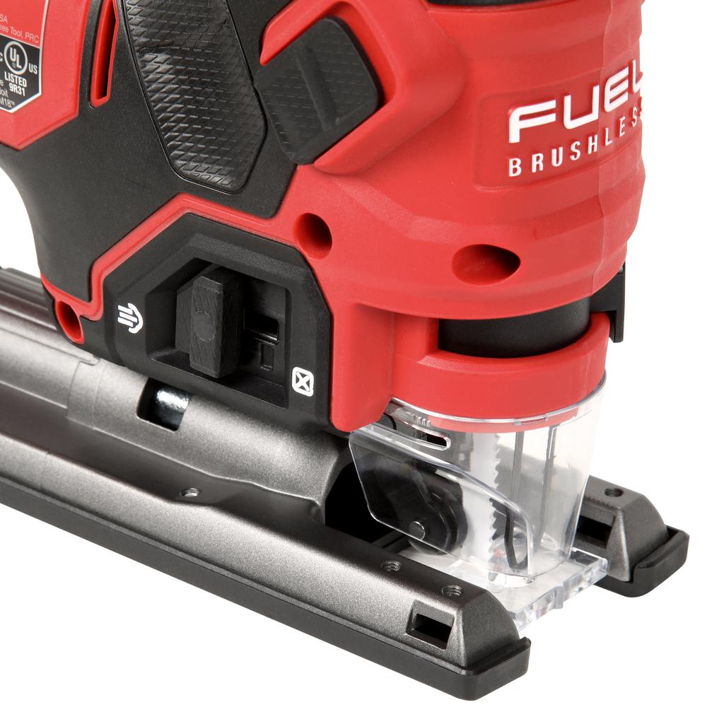 The M18 FUEL Cordless Brushless Barrel Grip Jig Saw combines power, blade speed and precision, to provide the highest quality cuts in a wide variety of materials. The M18 FUEL D-Handle Jig saw leverages the POWERSTATE Brushless Motor and REDLINK PLUS Intelligence to provide higher blade speed than corded jig saws at 3500 strokes per minute for clean controlled cuts with minimized chipping or bucking. Leveraging the M18 REDLITHIUM XC5.0 battery the M18 FUEL D-Handle Jig Saw provides up to 105 linear feet of cutting in laminated particle board, delivering all day productivity with less trips to the charger. The saw features tool-less blade change, tool free bevel adjust with detents at 0; 15; 30; and 45 as well as an LED light and on/off blower to keep the cut line visible while cutting.