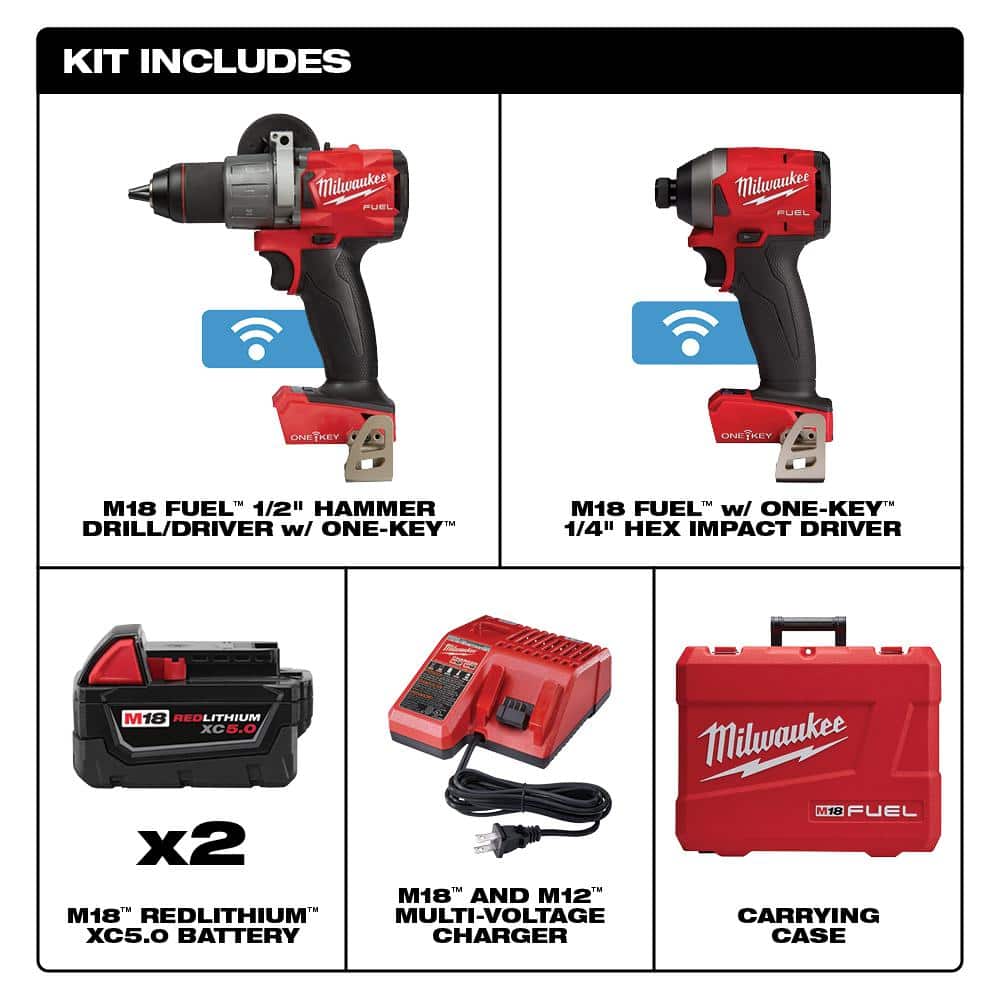 Milwaukee M18 FUEL ONE-KEY 18-Volt Brushless Cordless Hammer Drill & Impact Driver Combo Kit with Two 5.0Ah Batteries, Charger & Case (Model 2996-22)