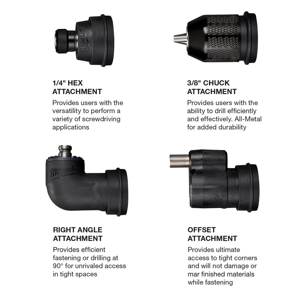 • ¼” Hex, 3/8” Chuck, and Offset attachments connect to Right Angle attachment for added versatility when drilling and fastening at a right angle