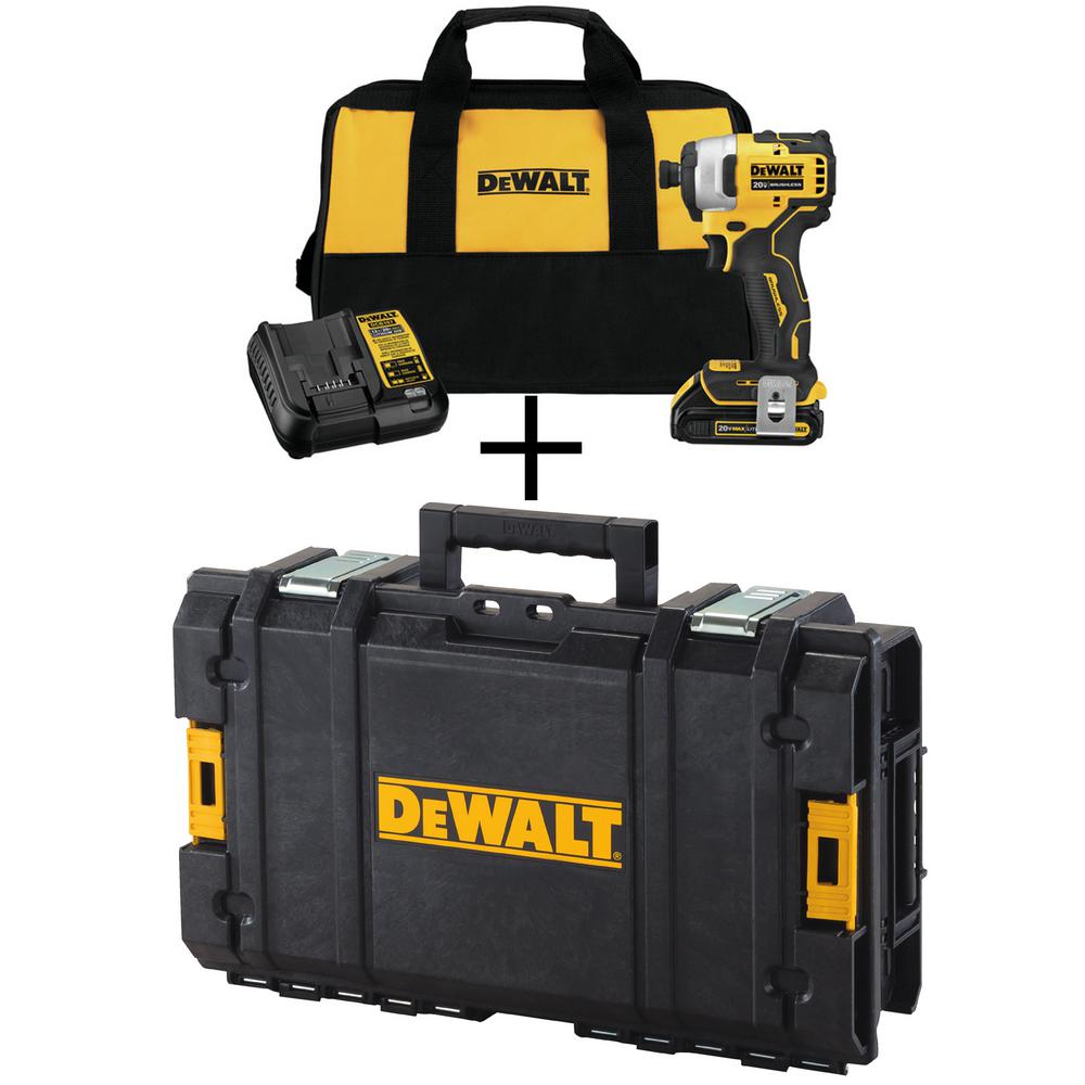 This 20-Volt MAX Compact Brushless Impact Driver Kit includes one 20-Volt MAX Lithium Ion Battery, 1 charger, and carrying bag. At only 5.1 in. front to back, the Impact Driver features a high performance brushless motor that delivers 1700 in./lbs. of torque and 3 LED lights to provide optimum illumination in dark spaces as you work. For increased comfort, the handle features an ergonomic design for balance and easier tool control along with a removable belt hook. Backed by a DEWALT 3-year limited warranty so you can buy with confidence. For a limited time get a bonus ToughSystem DS130 22 in. Tool Box with purchase.