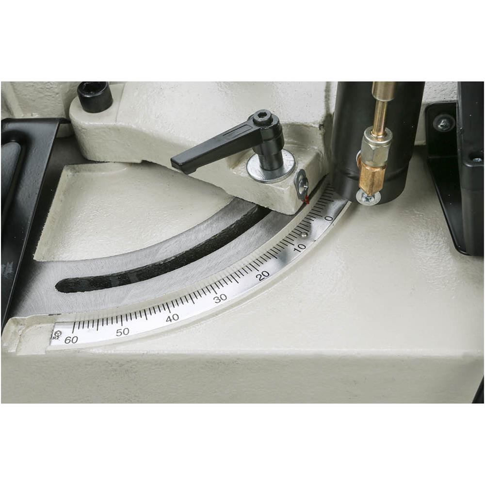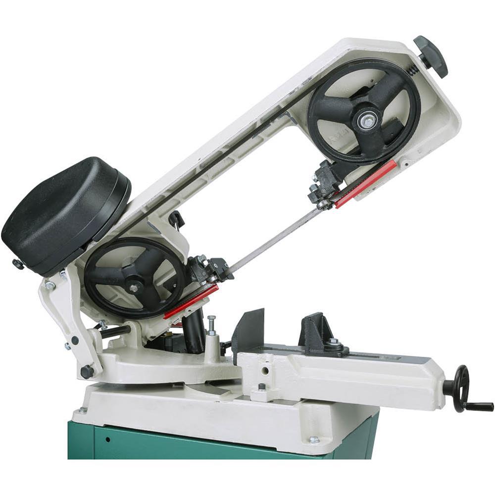This is 1 of the best saws on the market for the small or large shop. It features a 5 in. round and 5 in. x 6 in. rectangular capacity. But what really sets this apart from other saws of this size is the head swivel giving a maximum angle of cut of 60° Remember how much trouble it is to change a vise backing jaw only to get a 45° cut. Not with this guy. The easy-to-adjust head has stops in all the right places. And because the vise backing jaw is rigid on this saw, it is taller, giving it the ability to support the workpiece better. And of course, the machine comes with all the features you'd expect from Grizzly like hydraulic down feed control, easy access wheels for quick blade changes and the right blade speeds to do the job.