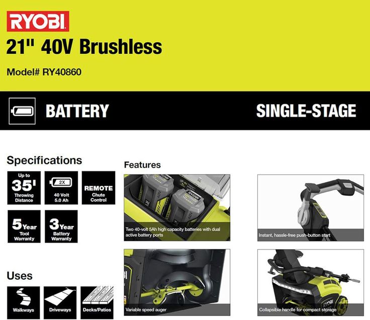 Take charge this Winter with the RYOBI 40-Volt 21 in. Brushless Cordless Snow Blower. Powered by two 40-Volt lithium batteries you can clear snow up to 13 in. without the hassle of gas or oil. Combining the convenience of cordless with a powerful brushless motor this snow blower delivers instant power at the push of a button. Adjust the 180° chute with the easy access directional chute control and throw snow up to 40 ft. away. Select the perfect setting with the variable speed auger, for faster snow throwing or more run-time. Equipped with two 40-Volt 5 Ah high-capacity lithium-ion batteries and designed with 2 active battery ports, users can extend their run time and achieve optimal performance. The telescoping collapsible handles make this product easy to fold down into its most compact form, ideal for tight storage spaces. The RYOBI 40-Volt Brushless 21 in. Cordless Snow Blower is backed with a 5-year limited warranty and is guaranteed to deliver results for years to come.