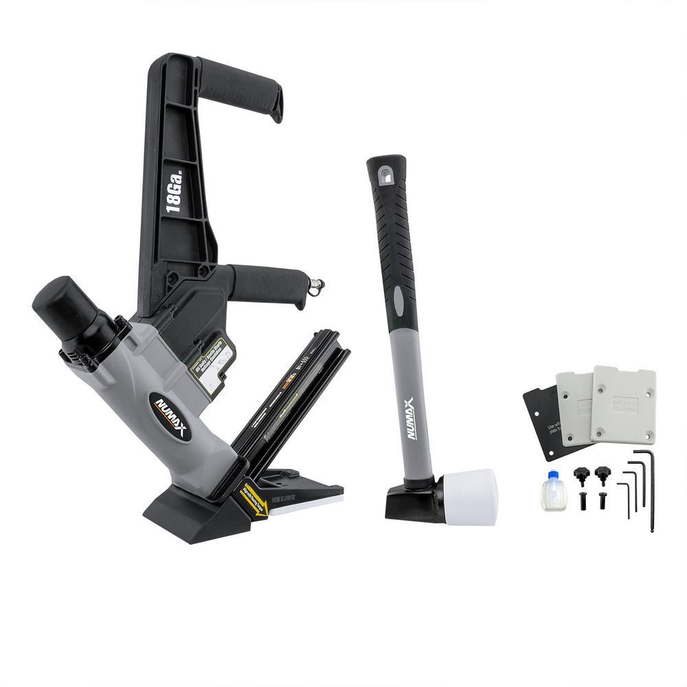The NuMax S18GLCNDH Pneumatic 18-Gauge 1-3/4 in. L-Cleat Dual Handle Flooring Nailer is specifically designed for the installation of most 3/8 in. to 3/4 in. tongue and groove hardwood flooring. This air powered flooring nailer comes with 3 interchangeable base plates and is compatible with 18-Gauge L-cleats from 1-1/4 in. to 1-3/4 in. The dual handle design allows you to use either the short handle or extended handle, depending on whether you prefer to stand or kneel during operation. This convenient option will save your back and help to reduce fatigue when working for long stretches of time. A no mar foot eliminates damage to finished flooring surface and ensures professional results for DIYers as well as construction contractors. Durably constructed of lightweight and high strength aluminum with heat treated steel parts, this dual handle flooring nailer is built to last. The Pneumatic 18-Gauge 1-3/4 in. L-Cleat Dual Handle Flooring Nailer includes a fiberglass mallet with a padded grip and rubber head, 3 interchangeable base plates, air tool oil and adjustment tools and is covered by NuMax's 1-Year Limited Warranty and 30-Day Wearable Parts Warranty.
