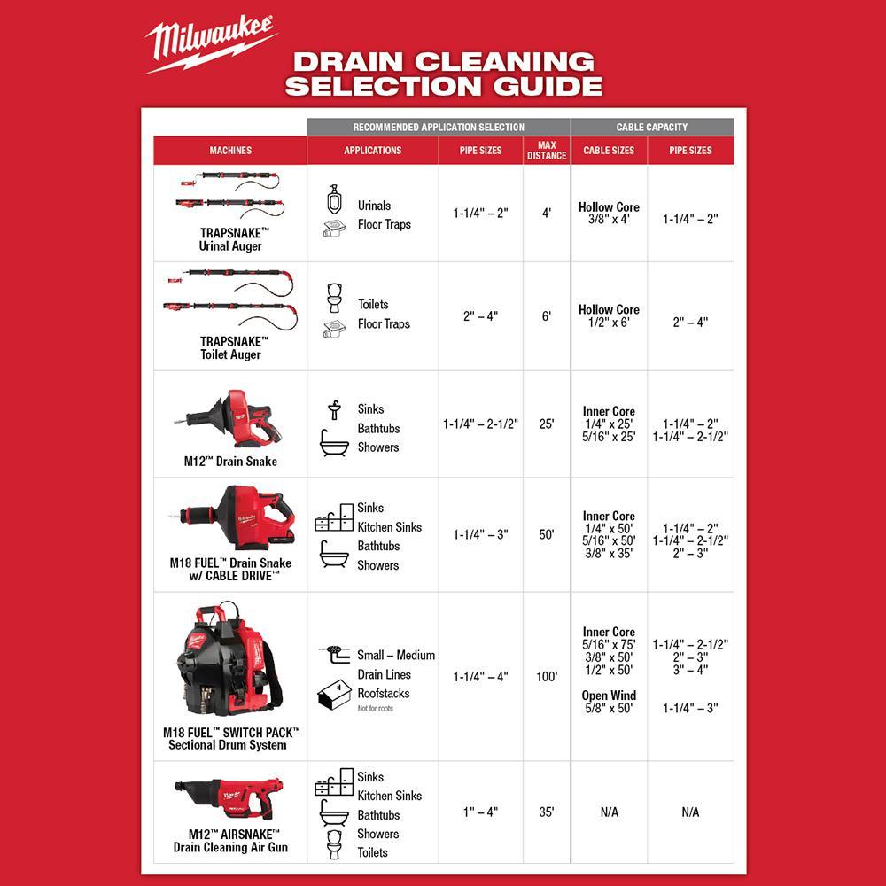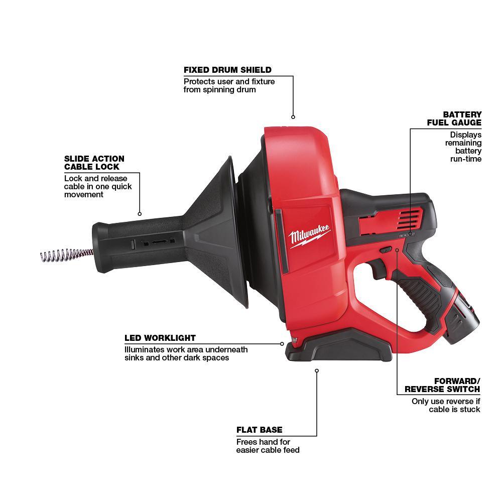 The M12 Drain Snake is the ultimate service plumbing solution for tough jobs through 2-1/2 in. drain lines; and weighing only 10 lbs., its the lightest professional drain auger cleaner on the market. Its unique, hybrid design provides the benefits of both handheld and floor based drain cleaners in one machine. The tools fixed drum shield with flat base protects users and fixtures while providing maximum tool support for easy cable feed. Plumbers, Facility Maintenance, and Property Managers will eliminate setup time when they switch from their corded drain cleaning machines to the M12 Drain Snake. Powered by REDLITHIUM Battery Pack which delivers more work per charge and more work over pack life than the competitors. REDLINK Intelligence provides optimized performance and overload protection against abusive situations. Include A M12 2.0 Ah Compact Battery Pack (48-11-2420).