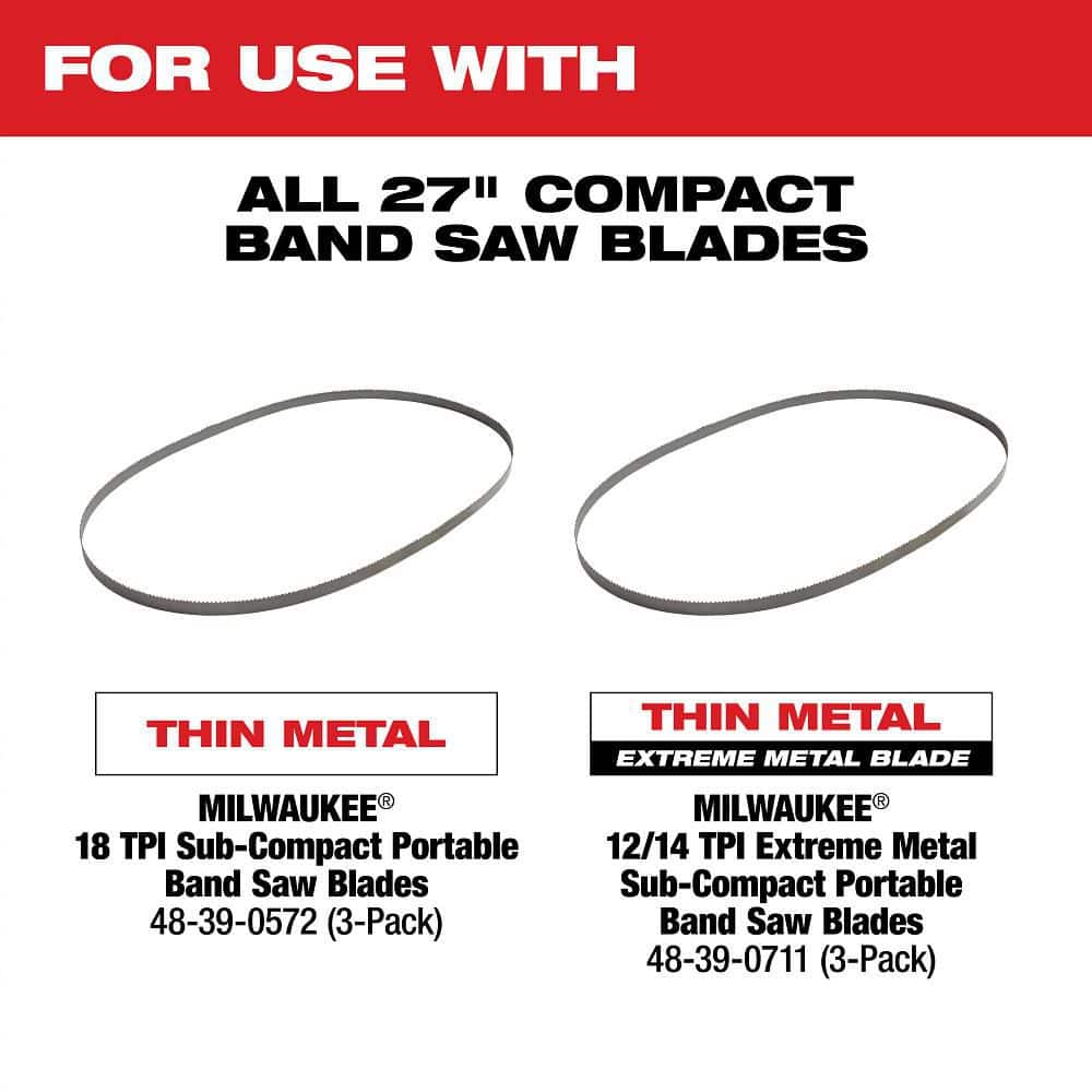 A: Use Milwaukee Sub-Compact 27 in. portable band saw blades; an 18 TPI blade is included.