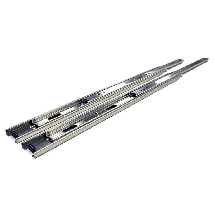 Full extension slides also telescope, allowing the full length of the drawer to clear the cabinet. Choose these when you need easy access to the rear of the drawer, as in a file drawer. High load rating allows you to install those slides on any type of drawer. Full extension drawer slides are ideal for cabinetry, furniture in kitchen, bedroom, bathroom, offices and also other woodworking projects. The rails are made from cold-rolled steel, in zinc and have precision steel ball bearings. Ball bearing features help to decrease noise during open and close the drawer.