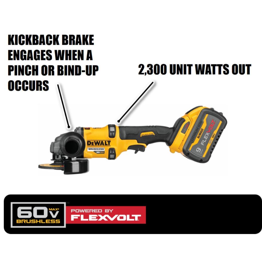 Upgrade to the FLEXVOLT 60-Volt MAX 4-1/2 in. to 6 in. grinder. It has up to 30% more power than the DCG414 60-Volt MAX Grinder with 2300 unit watts out. This grinder delivers 13 Amp power with a no-load speed of 9000 RPM to deliver ultimate power. It is part of the PERFORM and PROTECT product line to help keep users safe. Its Kickback Brake engages when a pinch, stall, or bind-up event is sensed and shuts the grinder off.