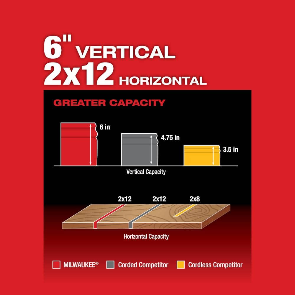 A: Up to 6 in. vertical, 2x12 horizontal at 90°, and 5-1/4 in. nested crown, with a maximum cutting thickness of 6 in.