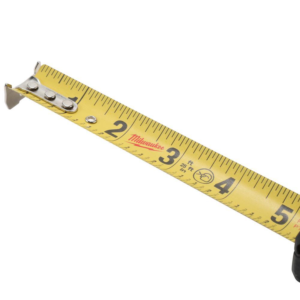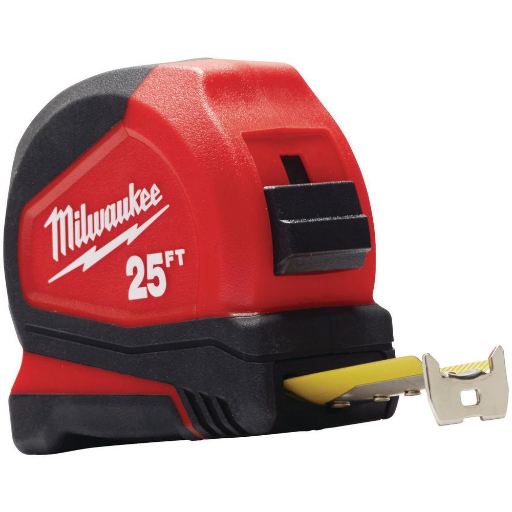 The Milwaukee 25 ft. Compact Tape Measures deliver up to 12 ft. of reach. These tapes are equipped with wear resistant nylon blade protection and an Impact-resistant 5-point reinforced frame to withstand the jobsite. An integrated Stamped steel belt clip enables users to easily carry the tape measure with them around the jobsite. The tape blade also features a Fractional scale. Jobsite Offset Scissors feature Iron Carbide cutting edges for maximum durability during tough cuts and an all-metal handle core for protection from drops and handle breakage. Bolt Lock Technology prevents blades from loosening to ensure precision cutting. For added precision, ruler markings are featured on the front of the blade.